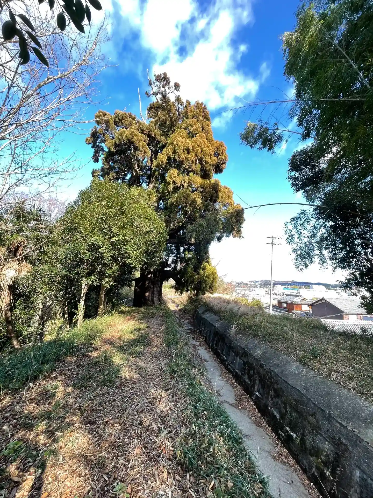 天井川になっている大沙川の堤の上にそびえる大杉があります。