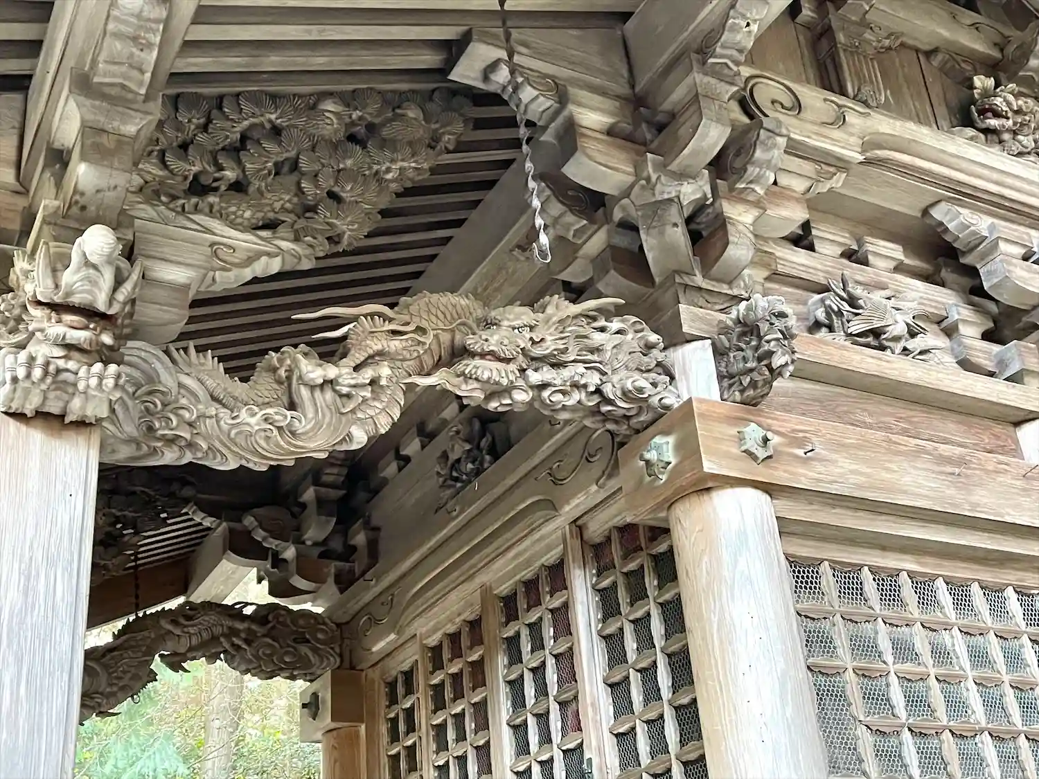 拝殿は木造平屋建て、入母屋、銅板葺き、妻入り、外壁は柱のみの吹き放し。本殿は一間社流造、銅板葺きで素晴らしい彫刻が施されています。