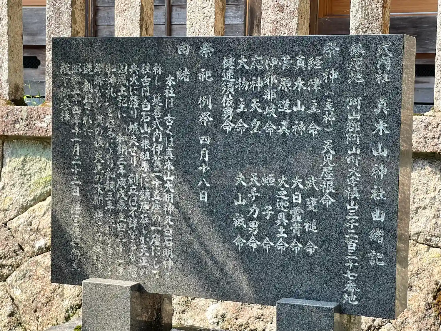本社は古くは真木山大明神、又白石明神と称した延喜式内伊賀二十五座の一座です。往古は白石山(根組原)に鎮座していましたが、天正の兵火に罹り焼失しました。創立は不詳ですが惣国風土記に「和銅3年庚戌奉圭田三十二束加神札」と在り、和銅3年以前なることが明瞭です。その後天正の末期に現在地に移遷創立されました。