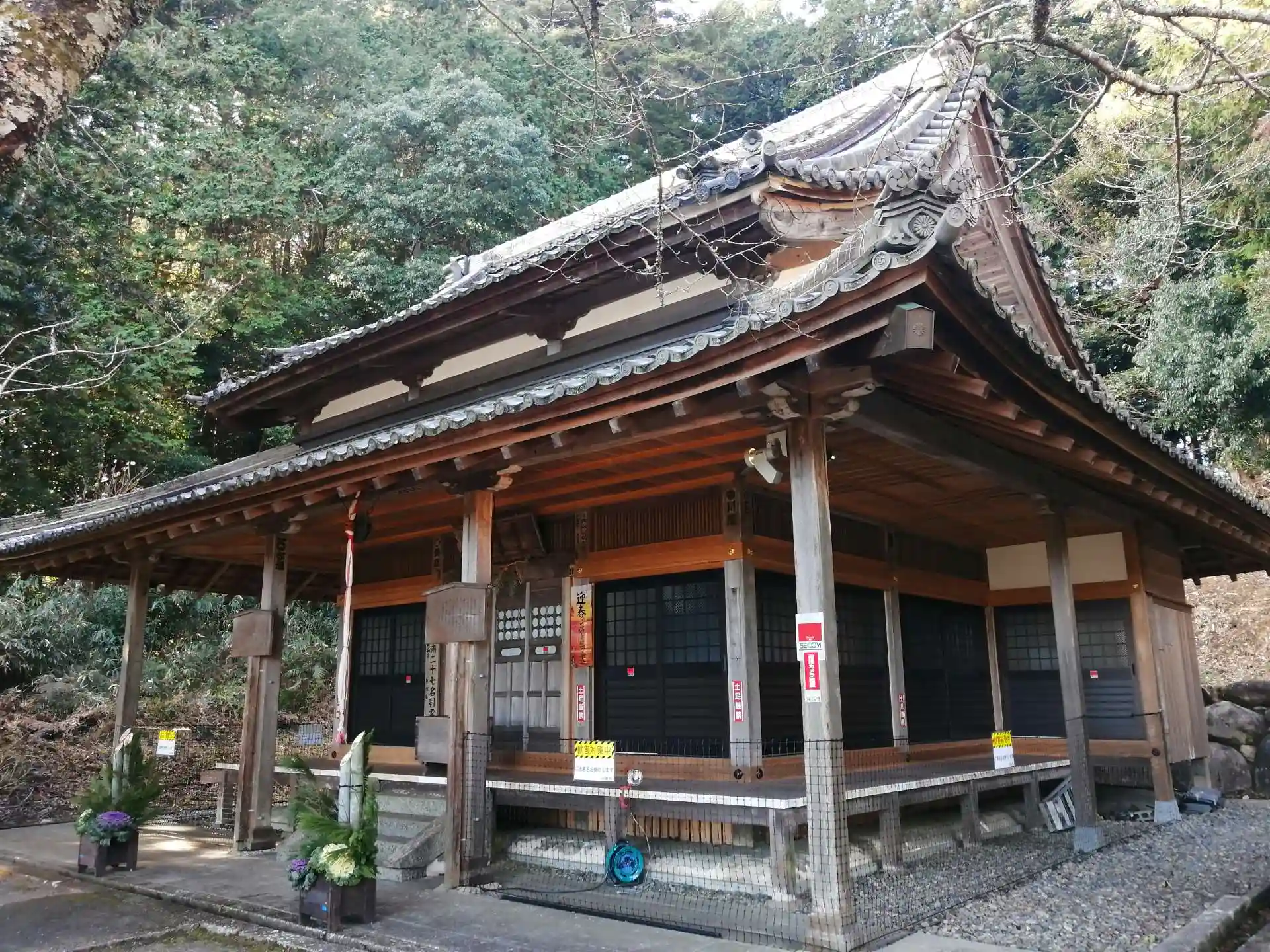 鐘楼が檜尾神社との境目にあり、鐘楼横の少しの石段を上がると本堂。扉が閉まっており堂の中は見れません。本堂の左手前に収蔵庫があり、この収蔵庫に本尊の千手観音が祀られています。開帳は先に記載の通りの年5日。