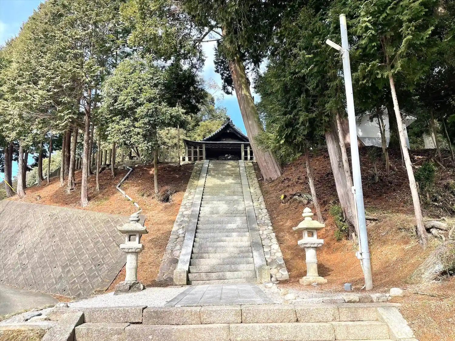 社殿までは急な階段で手すりもありません。何とか登りましたが、下りる際は怖いので、裏から坂道に回って下りました。