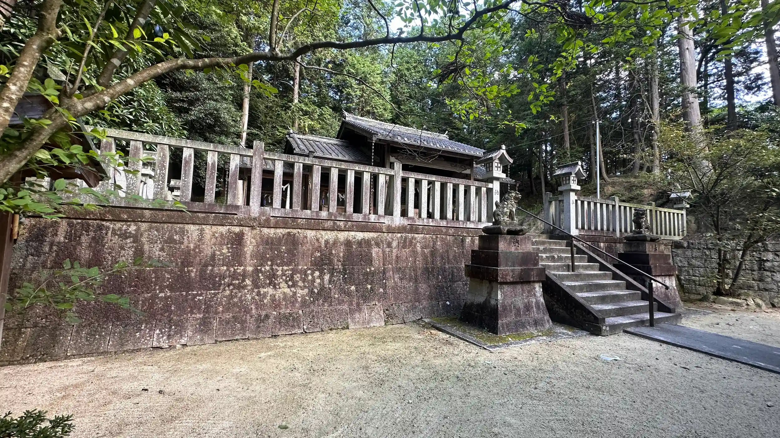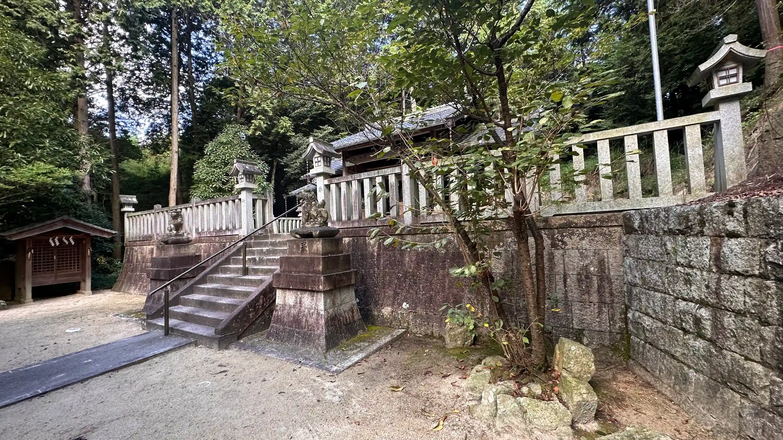 御祭神 大山咋神。本殿 一間社流造 覆屋あり、拝殿 入母屋造。一の鳥居から境内迄長い参道が田園の中を突き抜けています、参道は桜が多く春には桜のトンネルになるのではないかと思われます、境内の周囲は田んぼ、本殿の後ろは山、境内はとても手入れされていて綺麗で静かで落ち着きます。