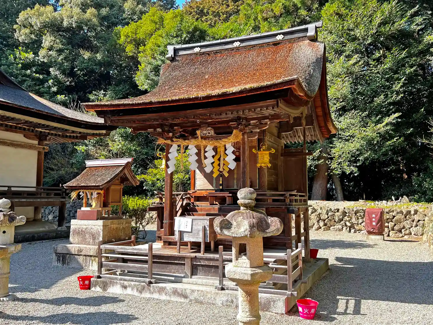 | 本殿 | 桁行三間・梁間三間、入母屋造、向拝一間、檜皮葦。 | |