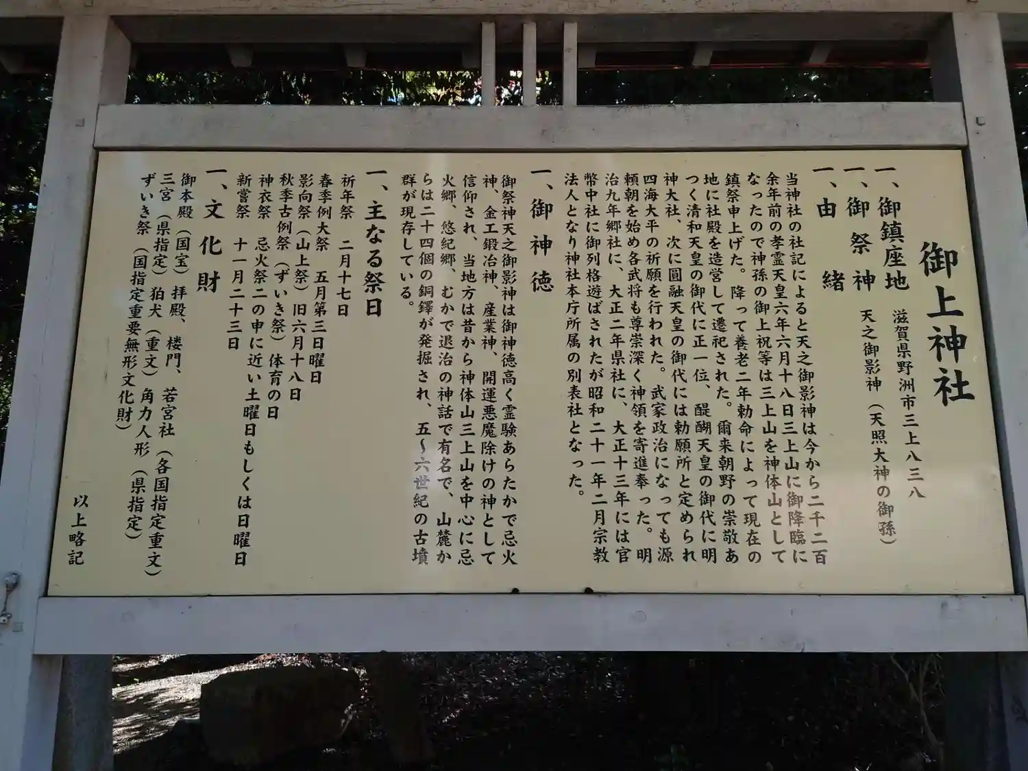 | ご由緒 | 第七代孝霊天皇の御代六年六月十八日に御祭神の天之御影神が三上山に降臨され、それから一千年の間御上の祝(はふり)等が三上山を磐境と定めお祀りしてきた。『古事記』の第九代開化天皇の段にも「近つ淡海の御上祝がもちいつく天之御影神」という記述がみえる。第四十四代元正天皇の御代養老二年三月十五日(現西暦グレゴリオ暦718年4月24日)に藤原不比等が勅命を拝し、現在の地に社殿を造営して遷祀された。(御上神社社務所作成のパンフレット『御上神社由緒略記』より) |