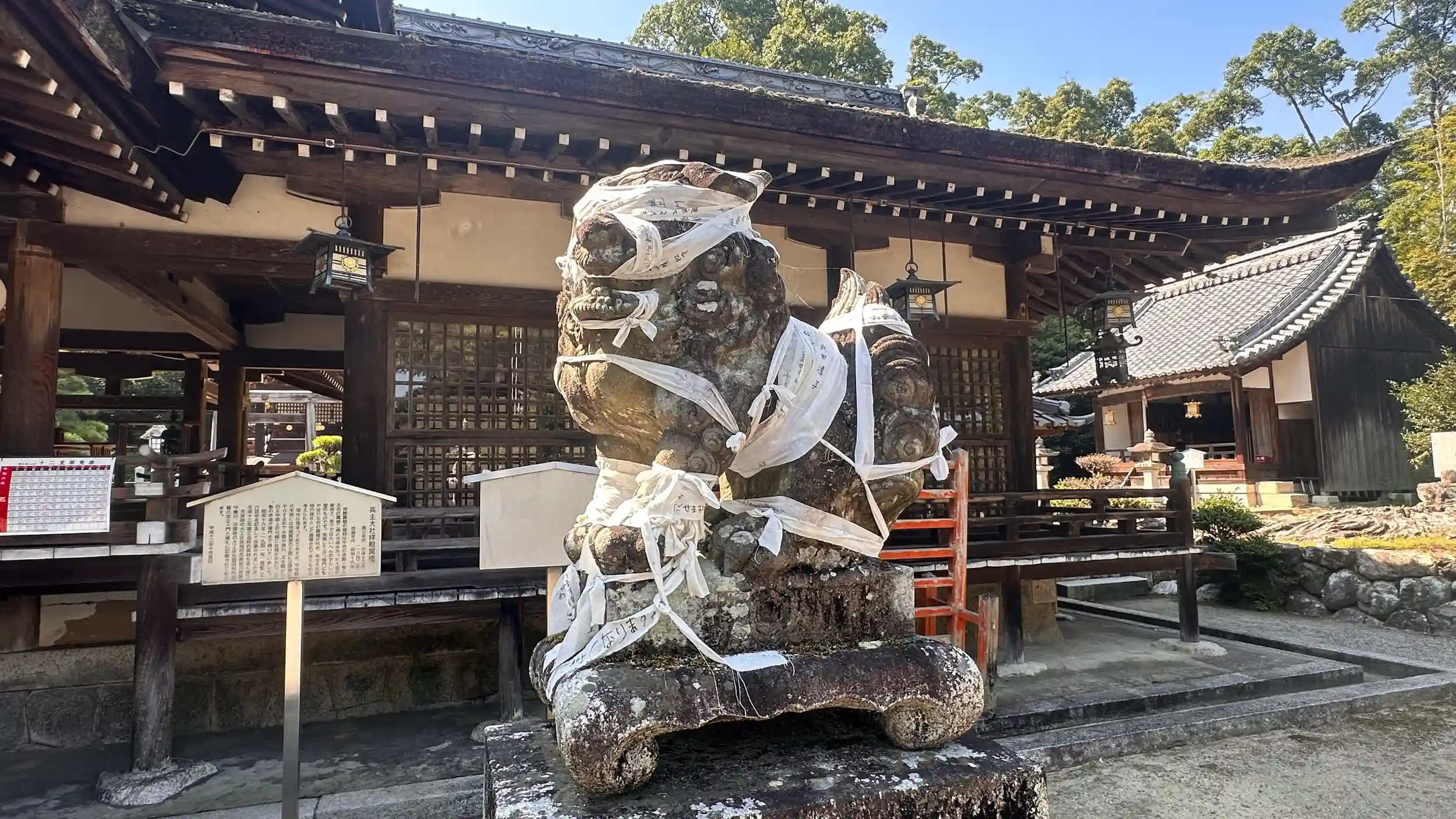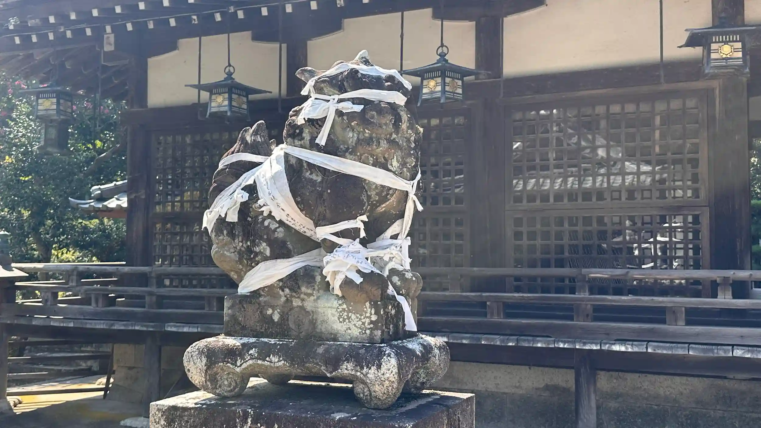 狛犬の全身に願い事が掛かれた布が、まるで包帯のようででぐるぐる巻きにされ瀕死の状態?