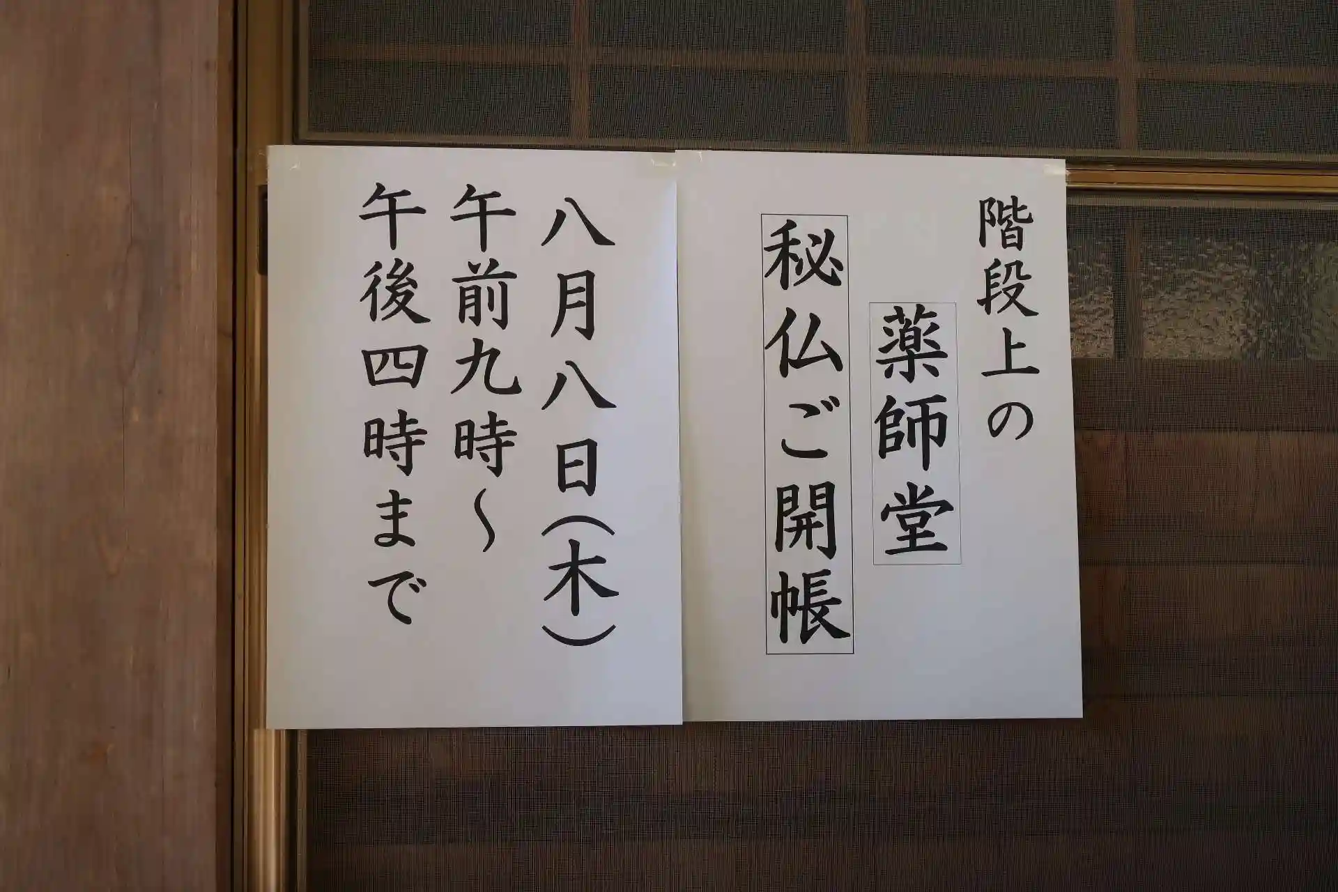 本堂に貼られた開帳案内