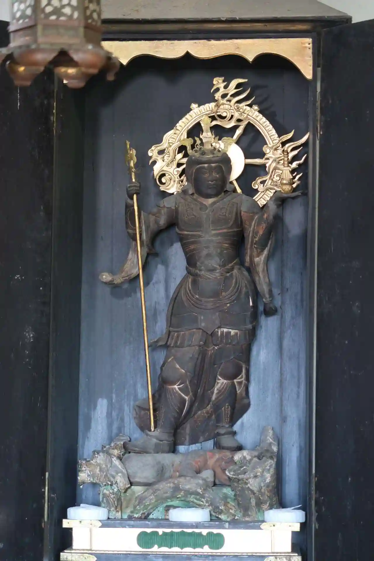 堂内に上がれますが下陣からの拝観。中央の厨子に薬師如来坐像、厨子両脇に日光・月光菩薩と6躯ずつの十二神将、その脇の左側の厨子に毘沙門天立像、右側の厨子に不動明王立像を安置。天台宗の形式です。(東光寺は天台宗であり、東光寺から伝来仏。)