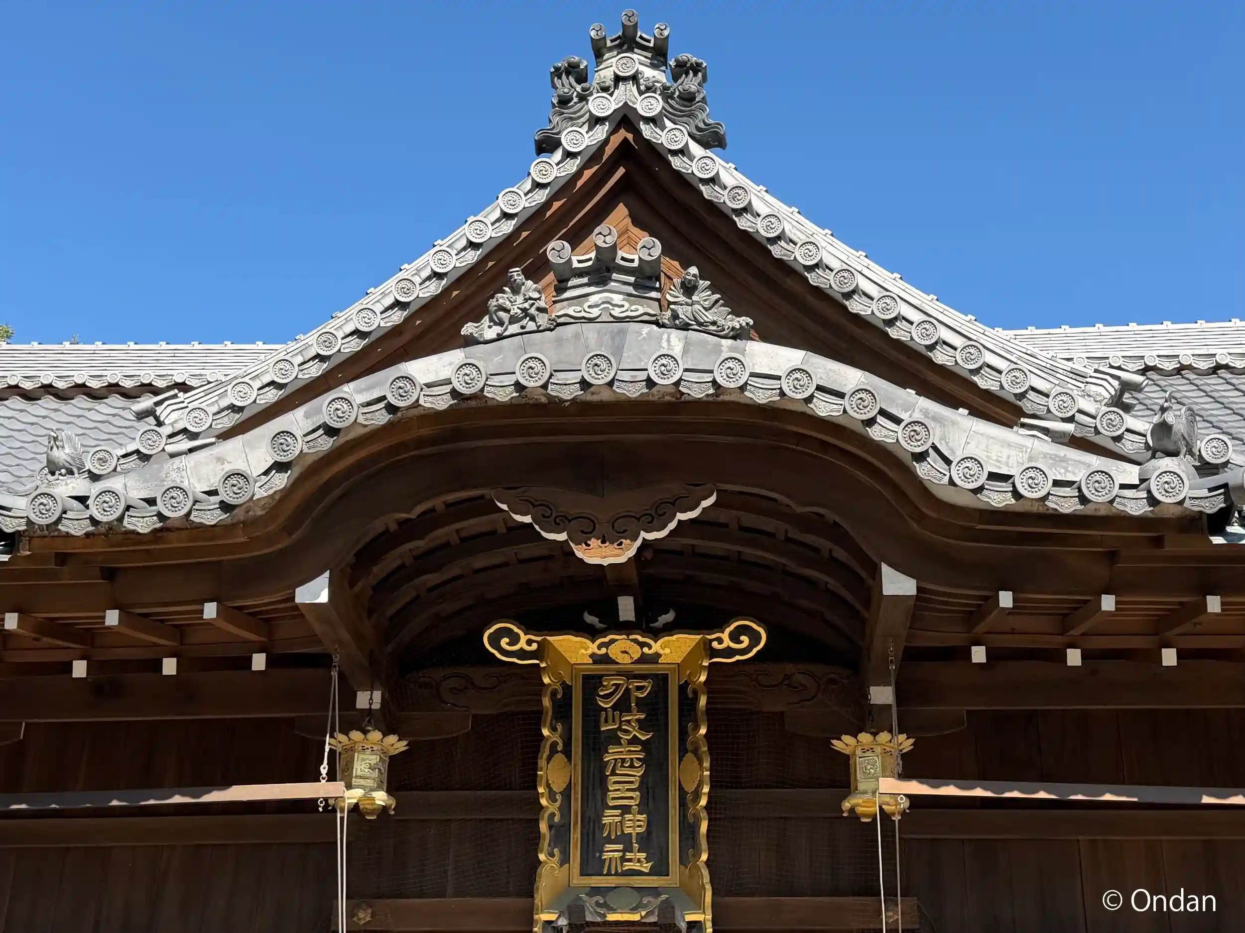 拝殿の屋根、唐破風の両側に鶏がいます。