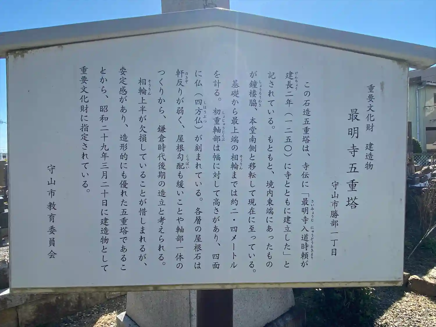 重要文化財に指定されている石造五重塔は、時頼が上洛の時に建立したと伝わっています。塔の初重軸部は幅より高さがあって、四面に仏が彫られています。