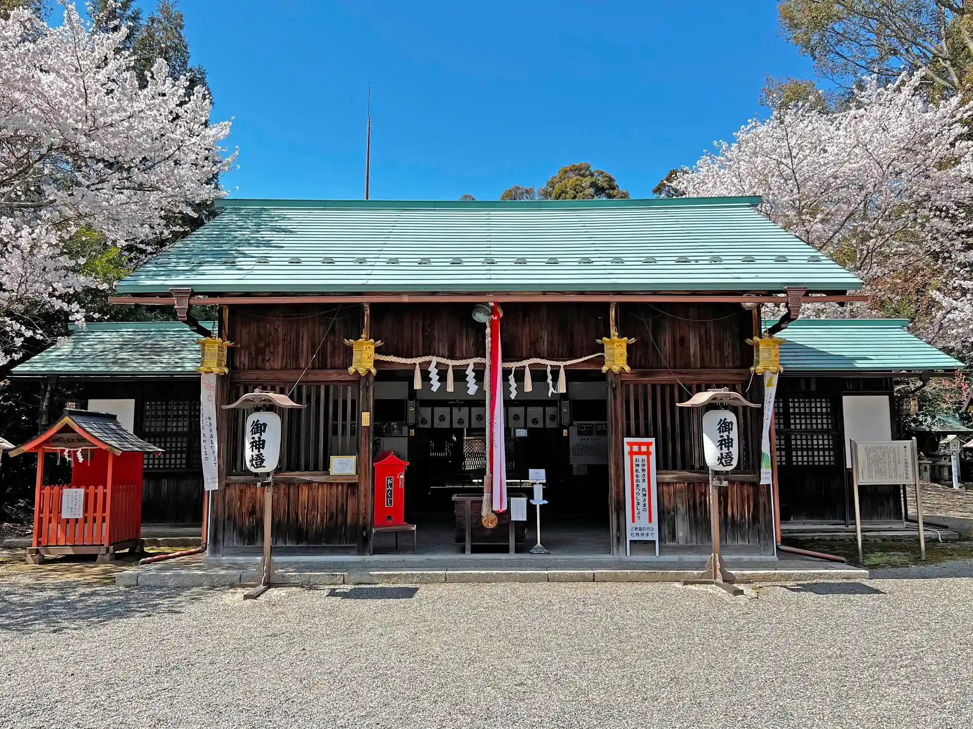 当社は、JR琵琶湖線・守山駅の北西4kmの農耕地の中の幹線道路(浜街道:県道26号線)沿いにある。琵琶湖東岸まで1kmの位置。道路沿いに100m以上ある境内は28,000㎡とのことで、社殿周り以外、すべて社叢となっていて木々が深い。空が抜けた広々とした社殿周りは、包まれ感があって心地良い(今回は季節的に満開の桜のサービス付き^^)。ちょっと変わっているのは、境内入口に鳥居がないこと(たぶん。あとで調べたら150m南西の浜街道から少し逸れたところに鳥居と社号標があることが判明。)と、駐車場がないこと(車だと境内に停めるルールなのかな?)。