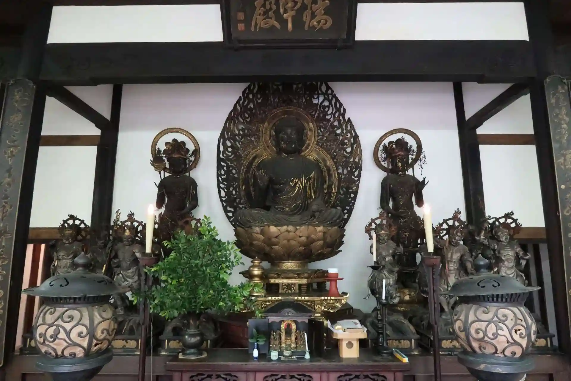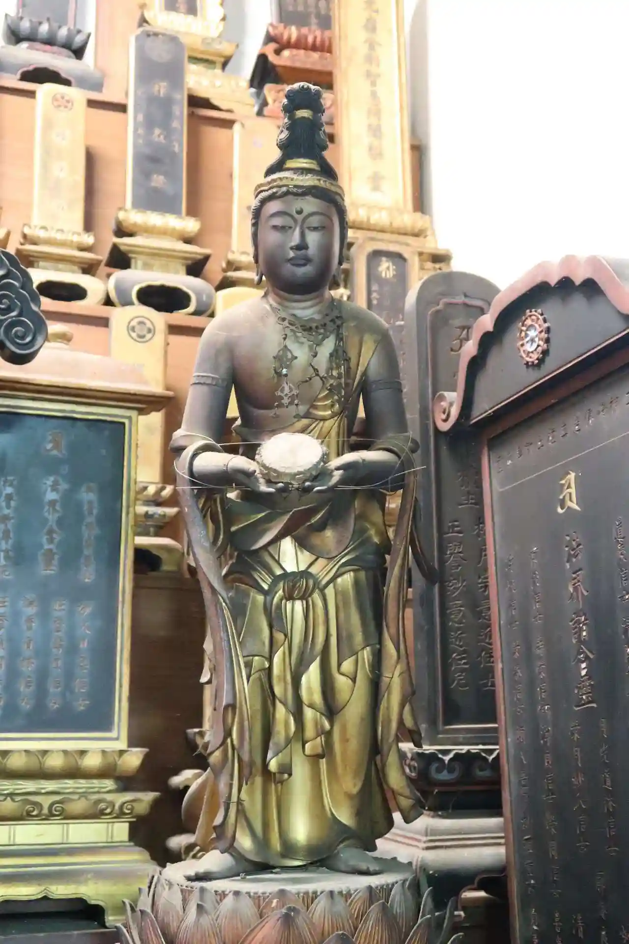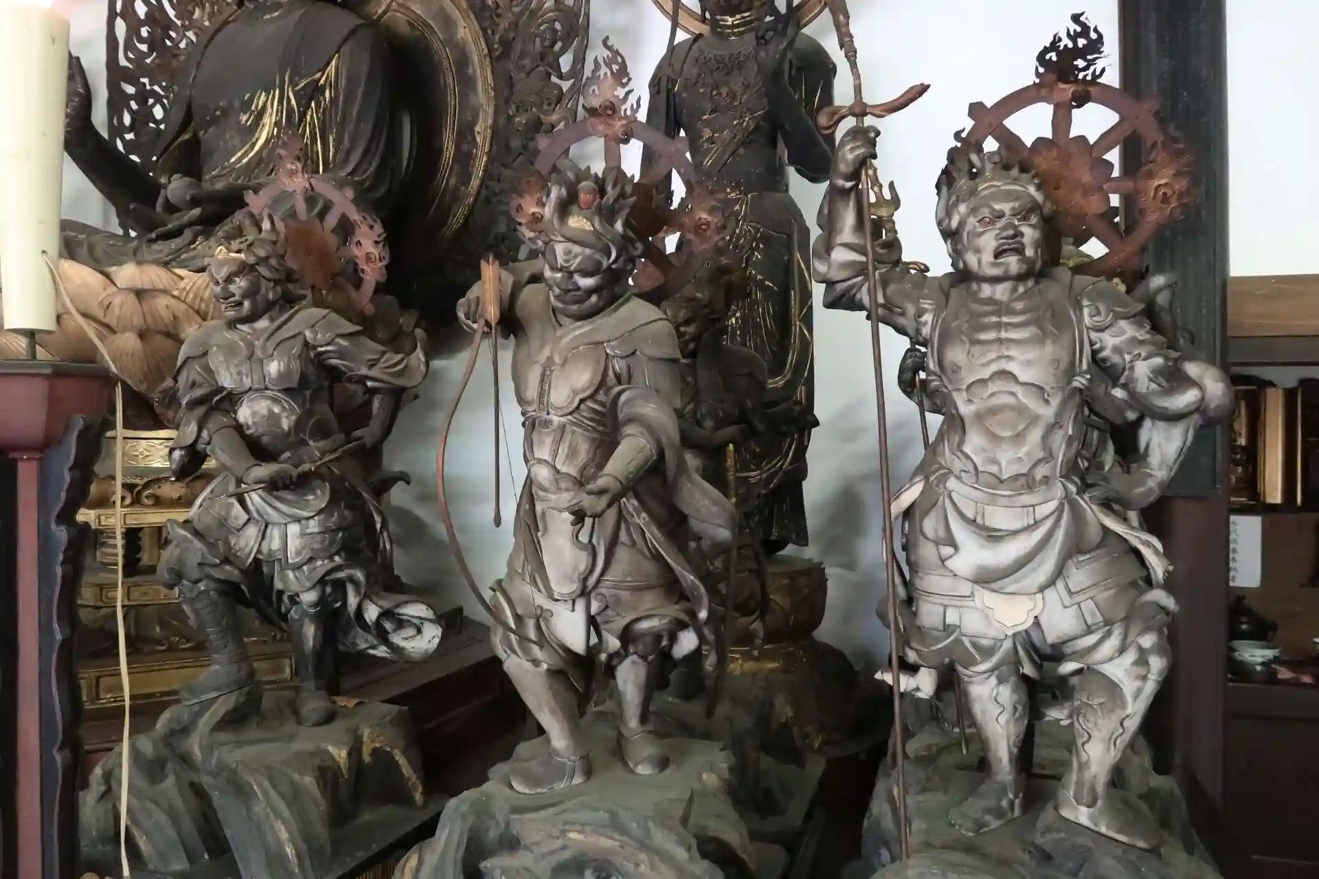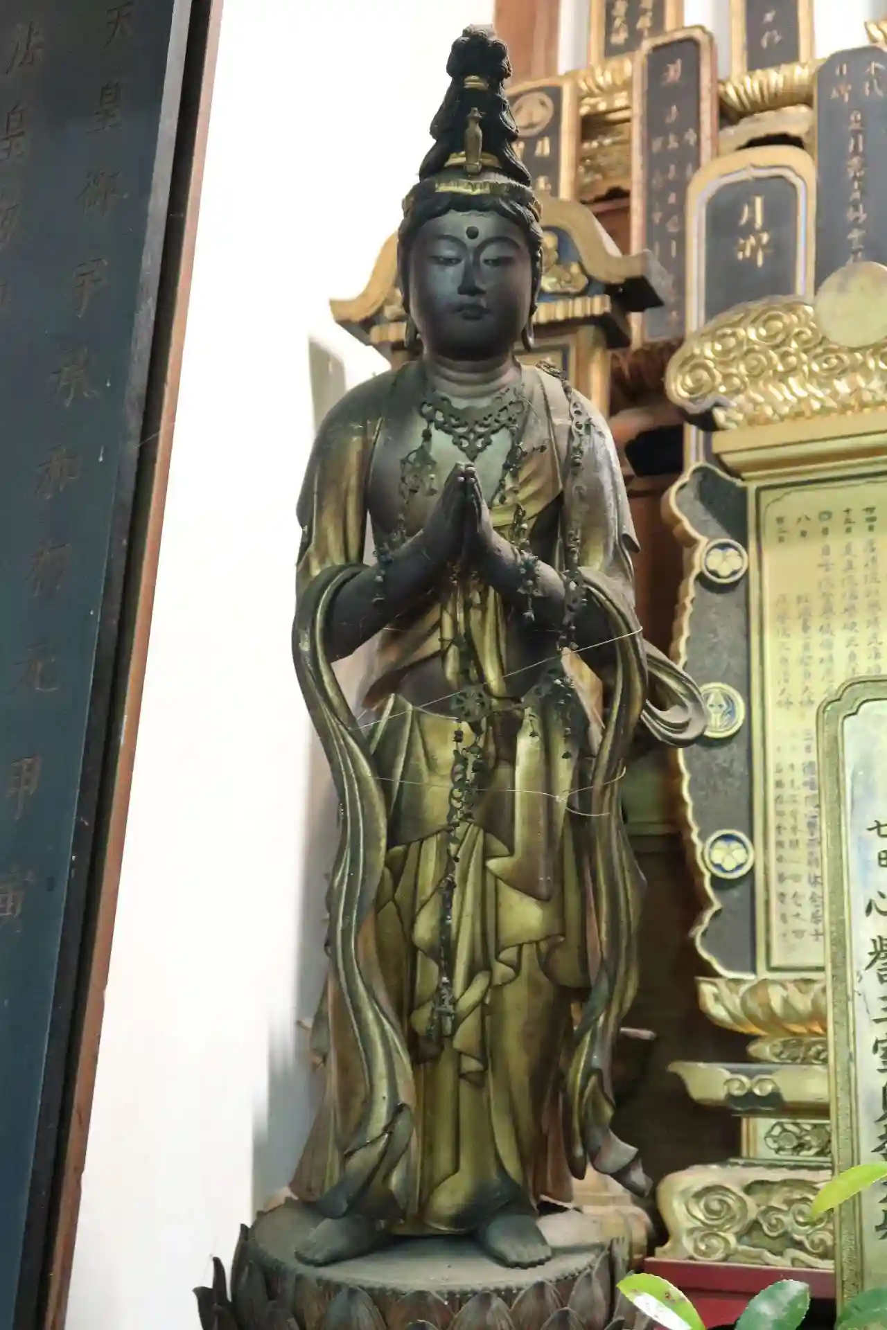 須弥壇の中尊は聖観音菩薩、左側に毘沙門天。右側の脇間には聖歓喜天なので厨子の中。左側の脇間には大黒天、不動明王、愛染明王、地蔵菩薩、等々が安置されています。