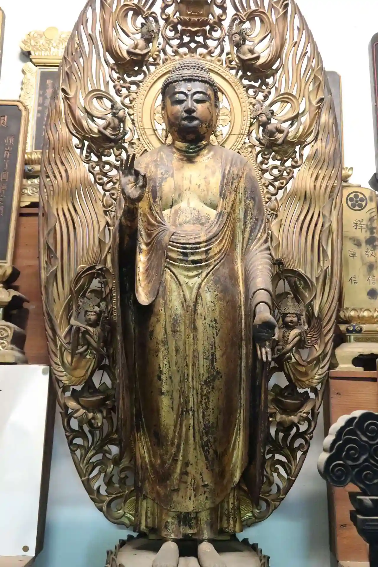 左側奥の間には位牌が多数置かれている所に阿弥陀三尊。中尊の阿弥陀如来立像は高さ約79cm、平安時代後期の作で市指定文化財。脇侍の観音・勢至菩薩は一具ではなく室町時代頃の作と思われます。ふっくらとしたお顔が優しそう。