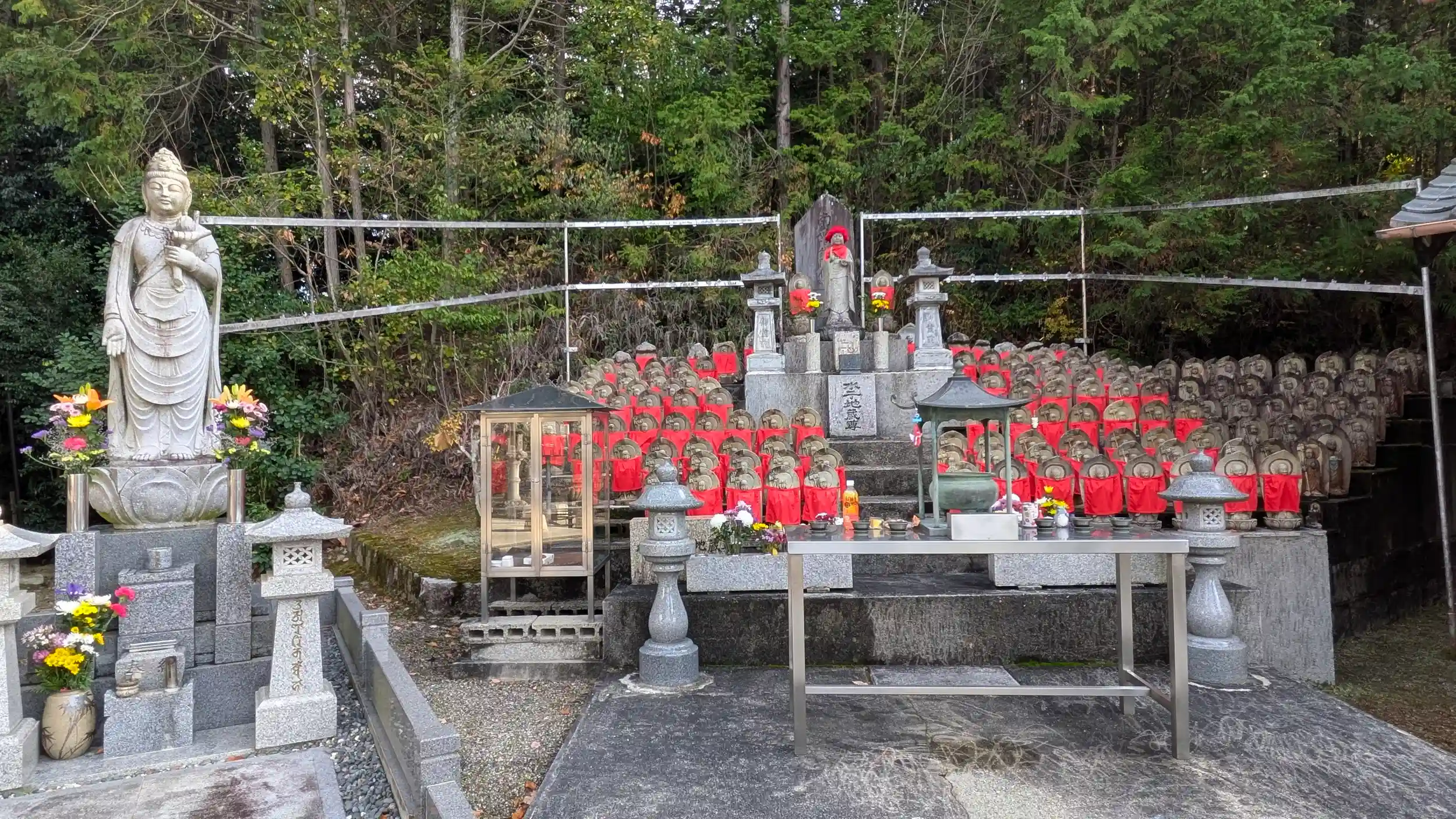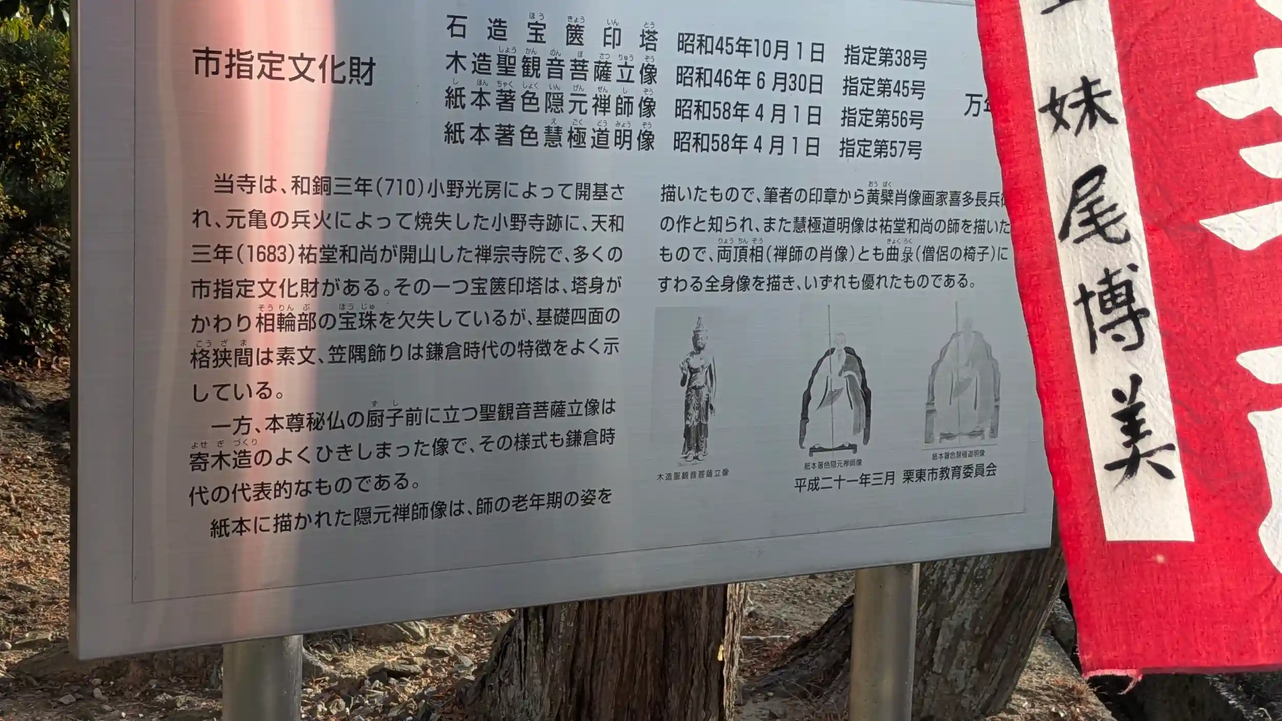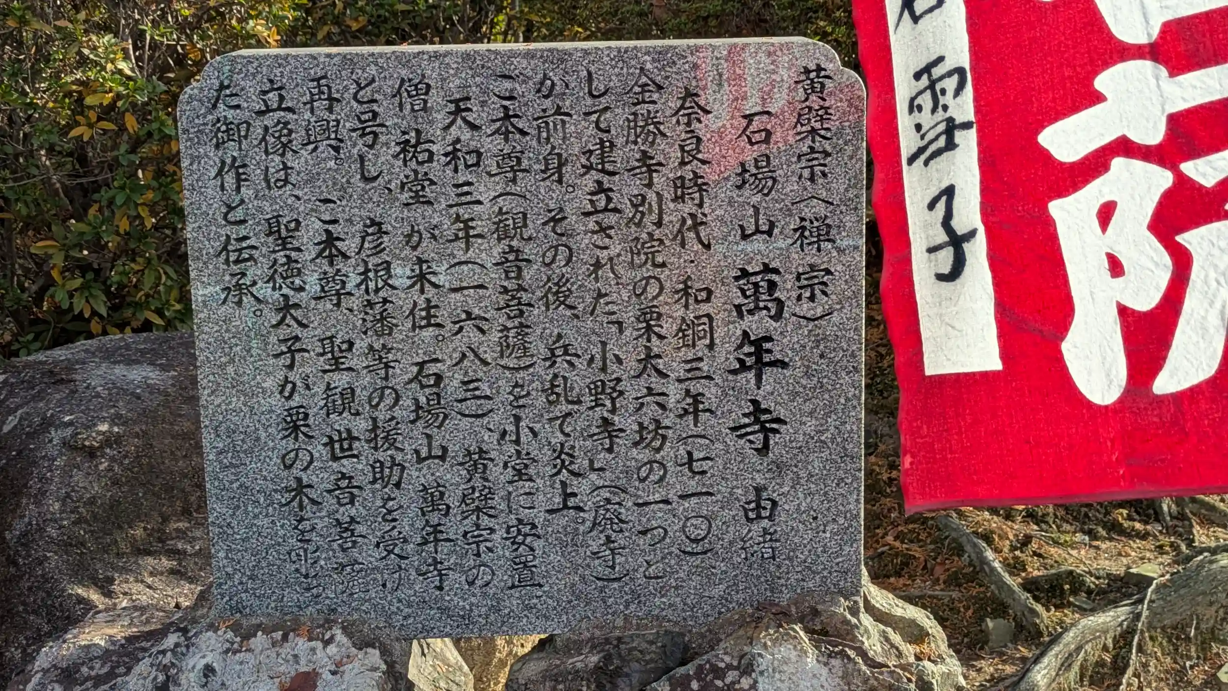 黄檗宗の萬年寺へ。もとは金勝寺栗大六坊の一つである小野寺があった場所であり、御本尊の聖観音菩薩はその小野寺の御本尊とのこと。聖徳太子御作と伝わるが検証結果は平安時代のものとされているのでちょっと残念😅庫裏にてお伺いすると奥様が御対応いただき御朱印を書く間本堂にお詣りをとのことでありがたく🤗聖観音様は秘仏ゆえ厨子の中。御前立の観音様が居られたのでお詣りさせていただきました。ちなみに御開帳は33年に一度であり、なんと昨年‼ということは次は32年後・・・生きてるかすらわからん🤣実物は見れませんでしたが写真パネルを拝見させていただきました😊ネットにも結構写真とかあがってるみたいです。まあ文化財指定されていますからね😊また機会あればお参りに来よう😊