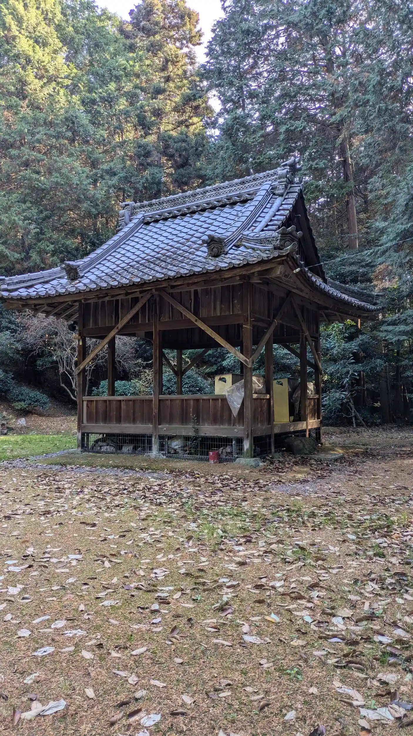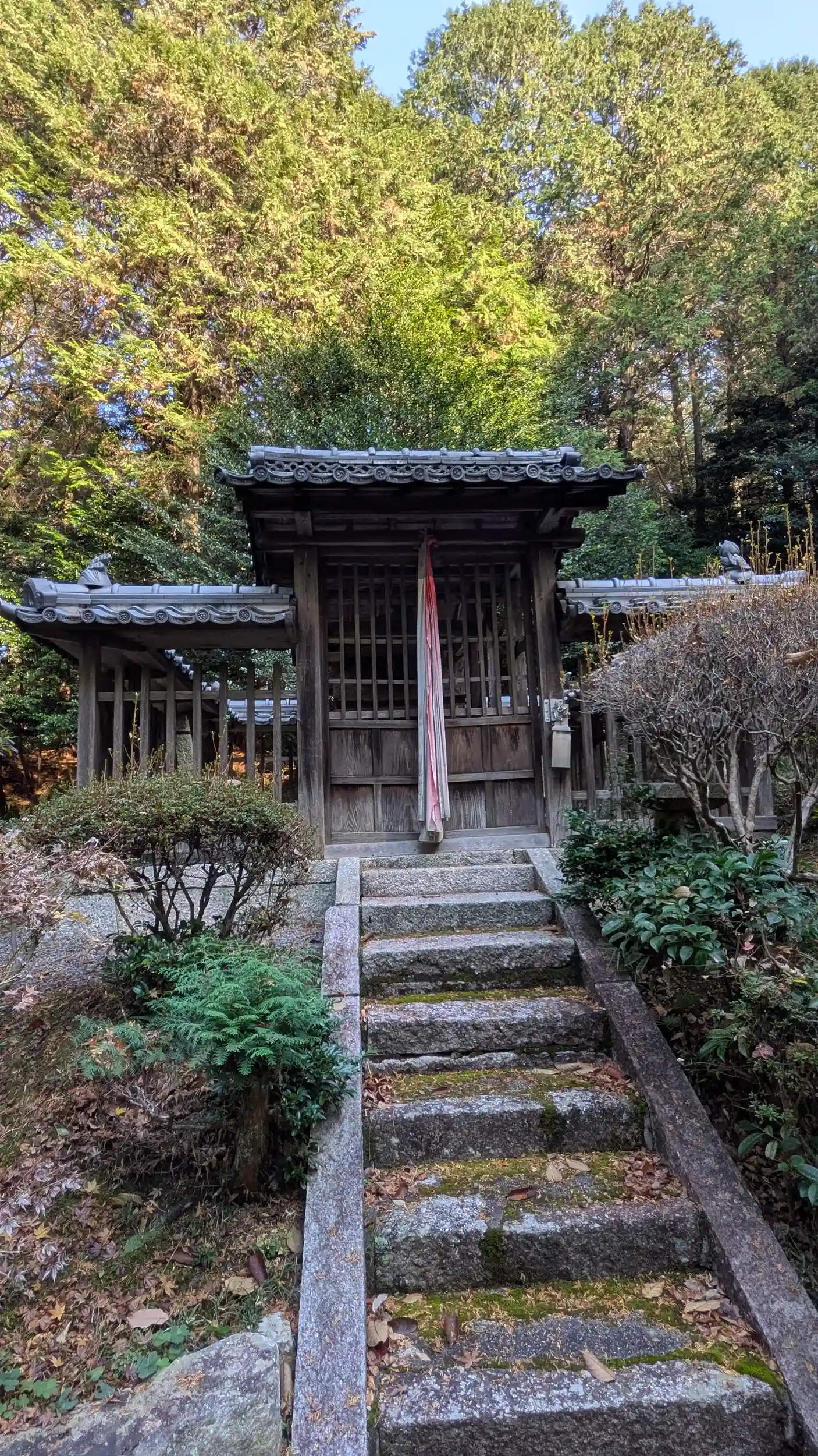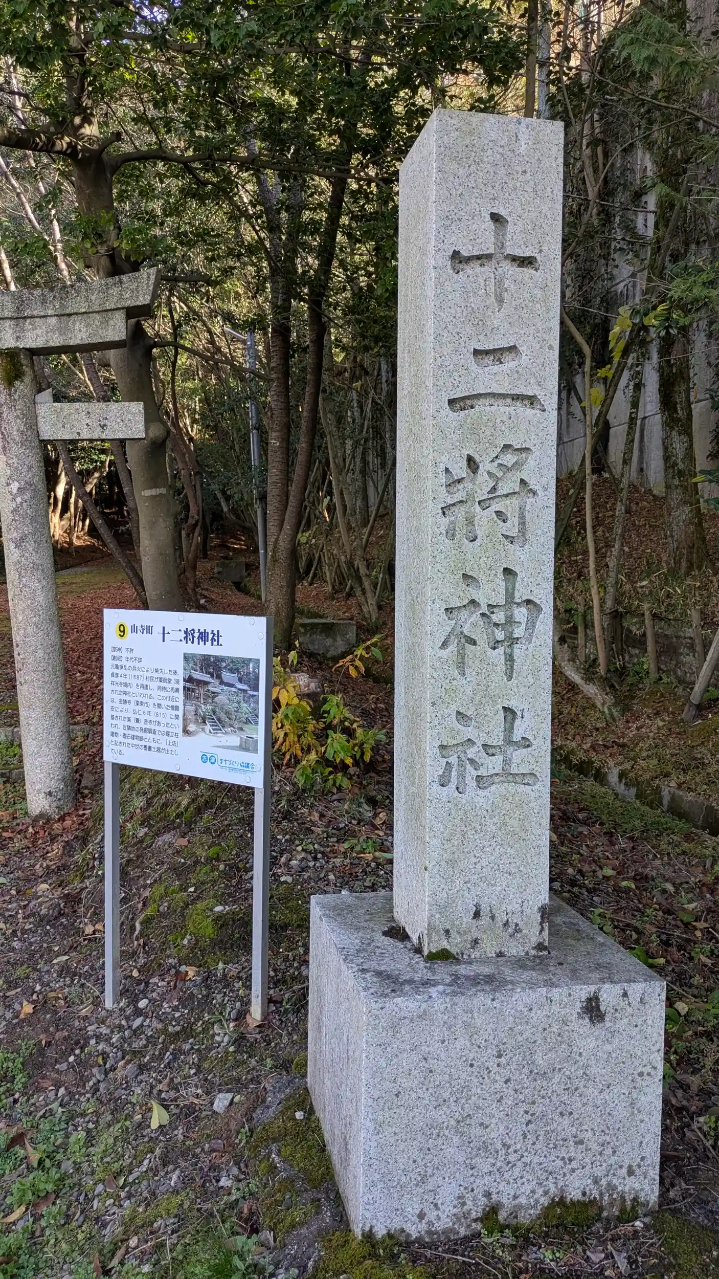 草津市の端。すぐお隣にある小槻大社の飛地境内。ですが小槻大社境内は栗東市になります。このあたりも樂(覺)音寺の境内だったようで祥光寺の薬師堂再建時に薬師如来守護の十二神将を祀る神社として再興されたようです。そのため仏教色が強いせいかあまり派手さのない質素な感じの境内です。静けさを感じられるいい境内ですけどね😅山門前の案内板以外に由緒等は見当たらず。