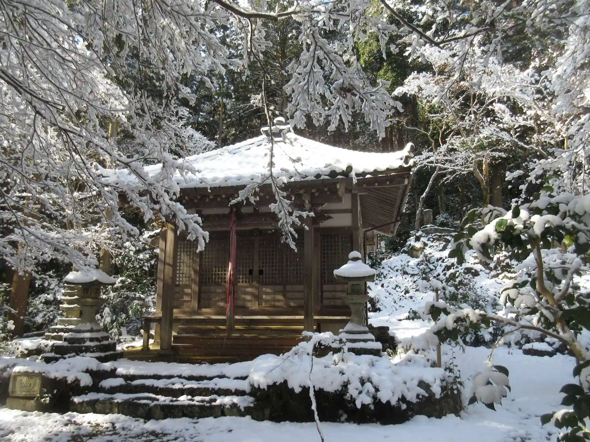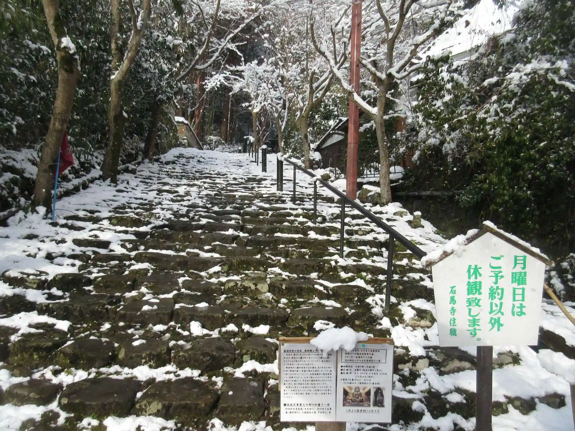 バス停を降りて少し歩くと寺に上る石段に到着する。幸い、雪は止んできた。ごつごつした石段をはあはあ言って上り、拝観をお願いする。拝観料500円。ちなみに、この石段を白洲正子(白洲次郎の妻)は、「かんのん坂」と呼んだのだそうです。