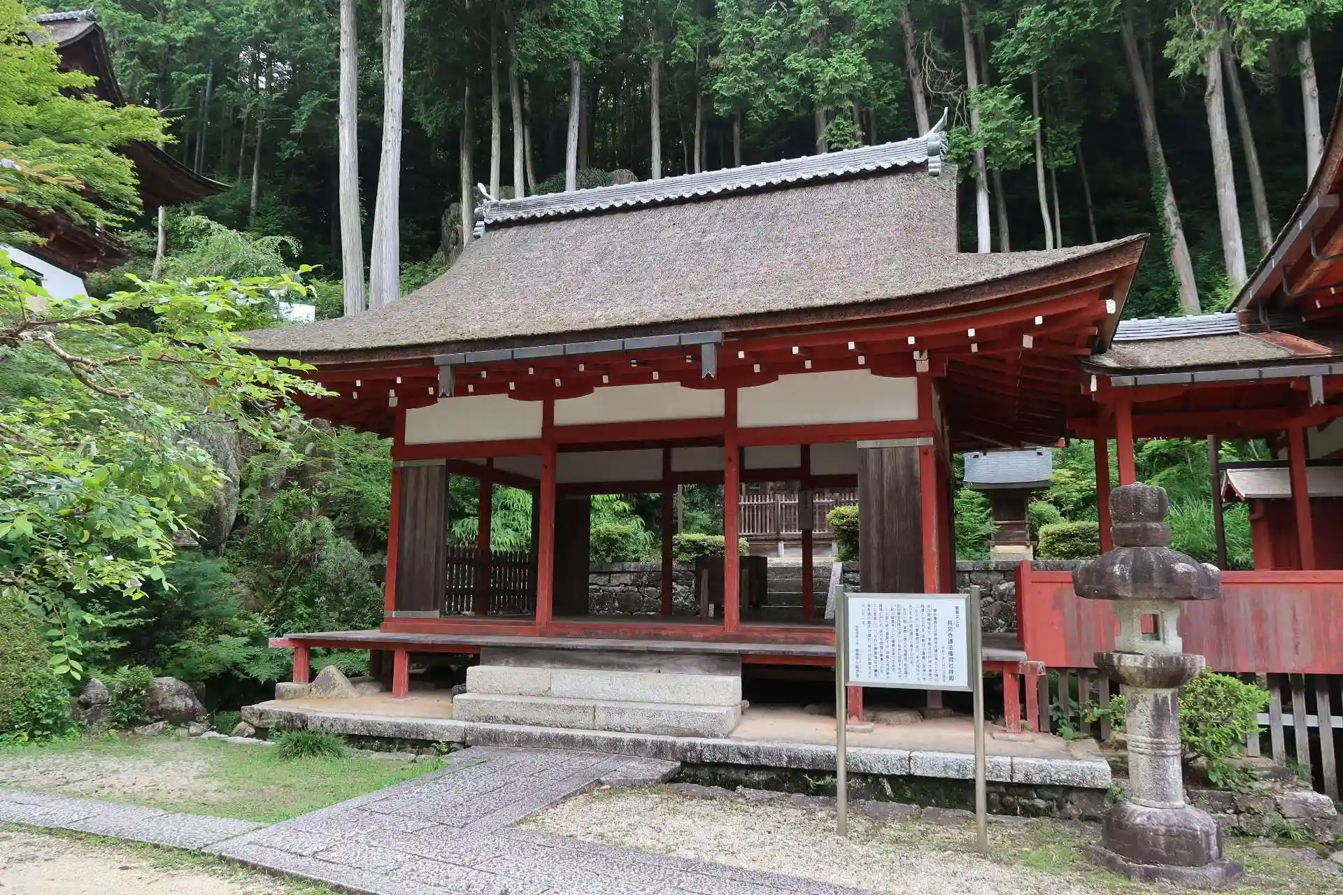 本堂は左側の広場の方に入口があります。早速本堂に入り、下陣で手を合わせてから、納経所で御朱印を頂きました。本堂からの渡り廊下を進むと三仏堂、続く渡り廊下を進むと護法権現社拝殿です。その先の石段を上がると鐘楼、如法行堂。振り返ればこれまでの諸堂が眼下に見えます。