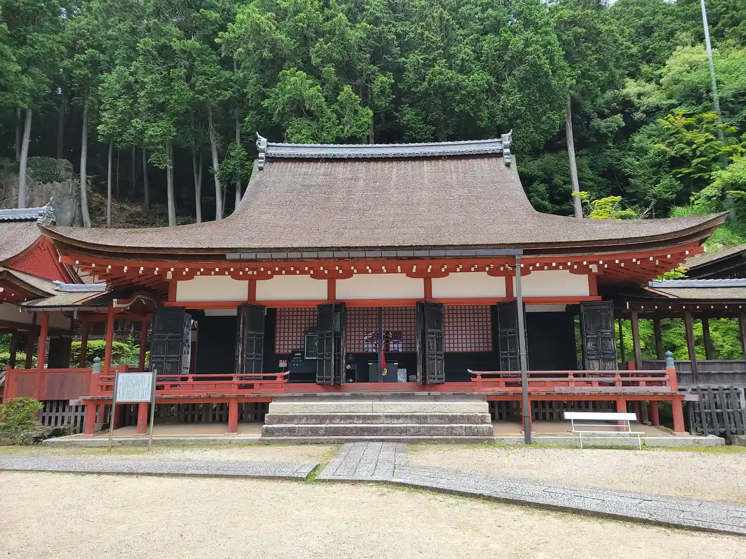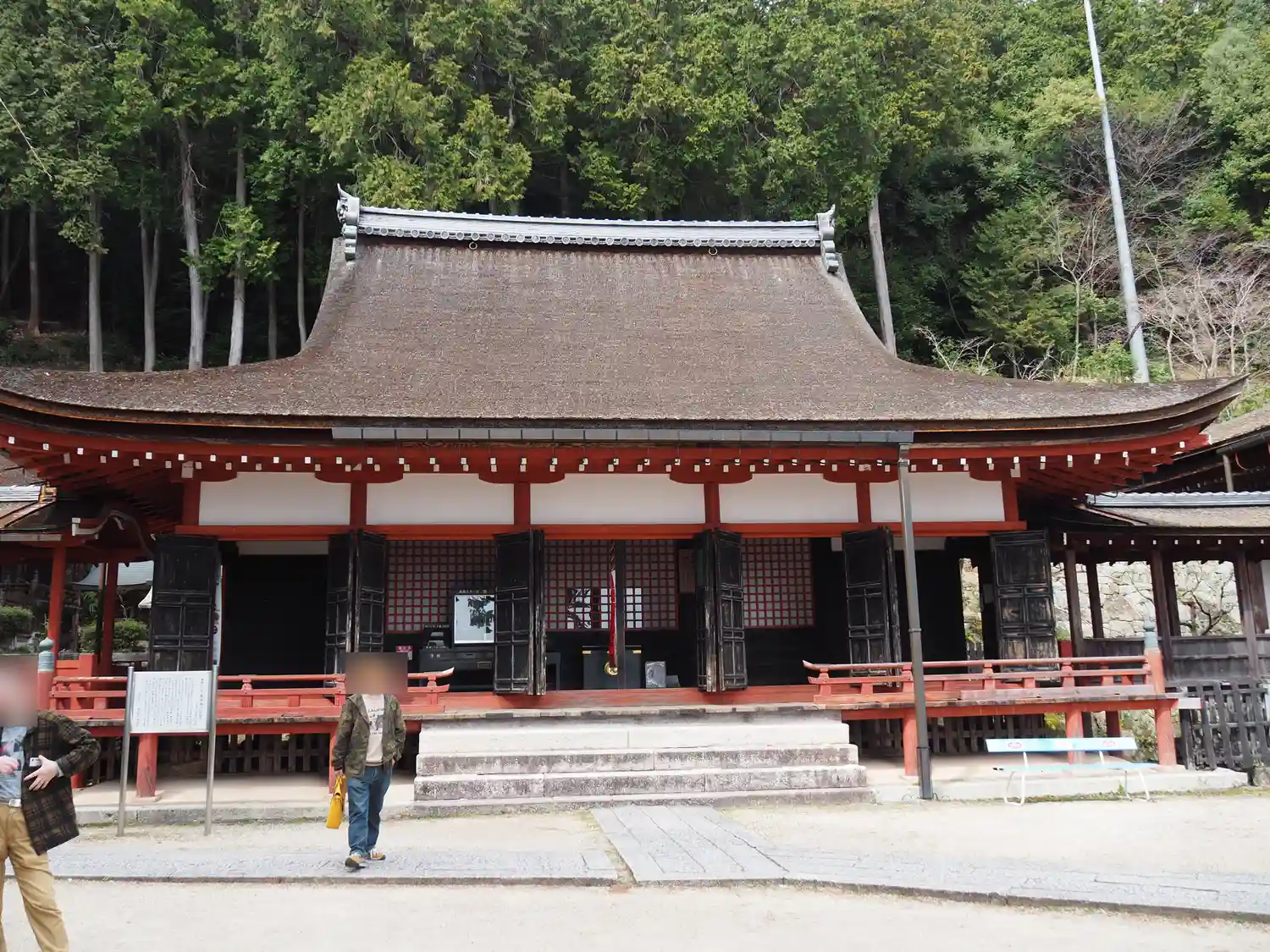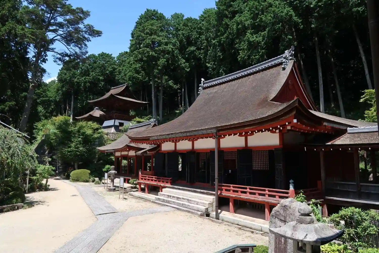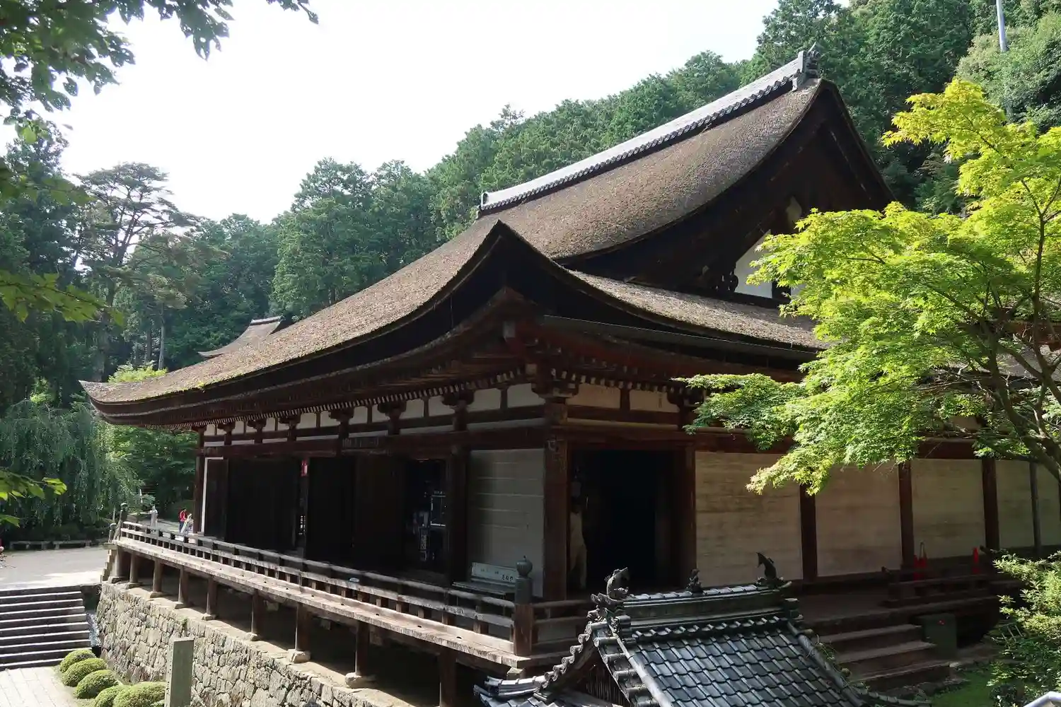 いよいよ<本堂>。1516年に焼失後、1522年から1524年にかけて再建。当寺最古の建築。桁行七間、梁間六間、一重、入母屋造、檜皮葺。国指定の重要文化財。