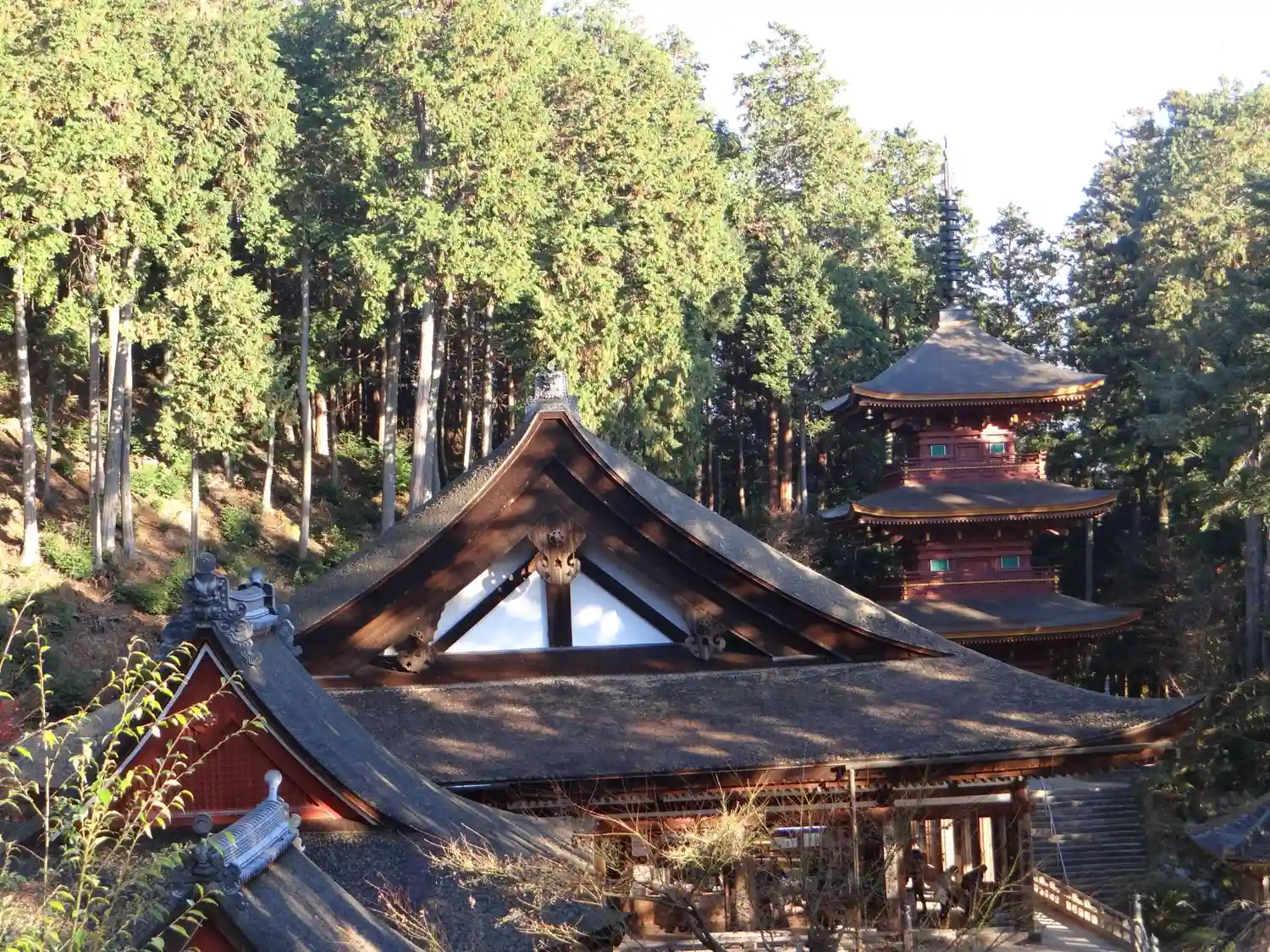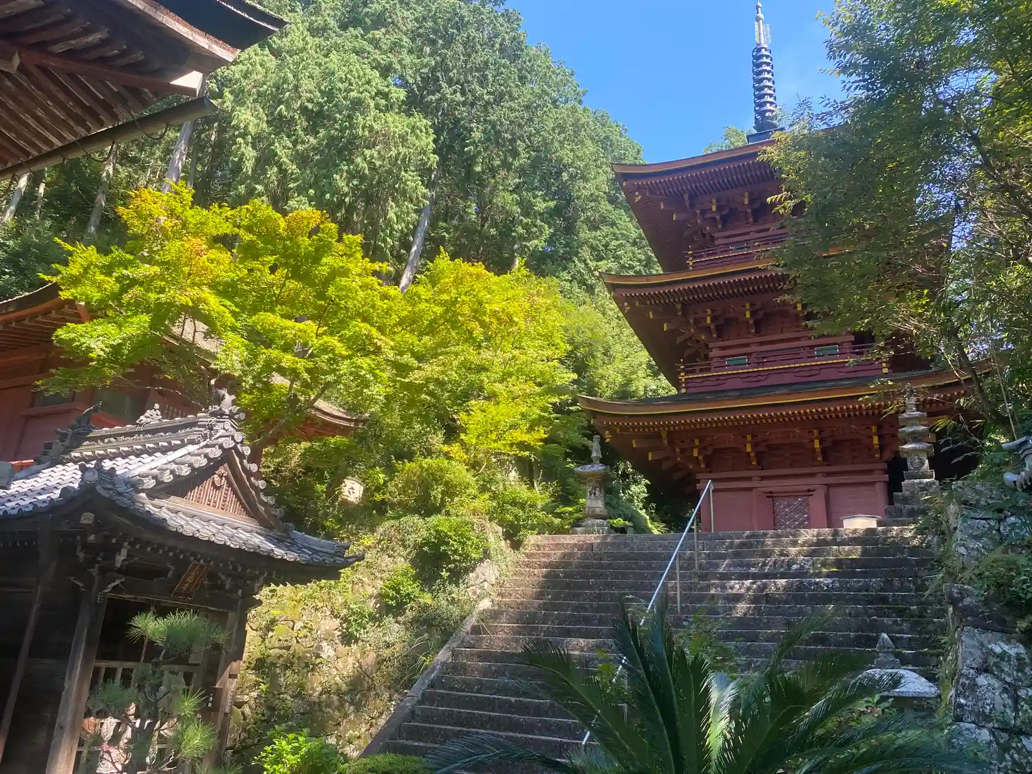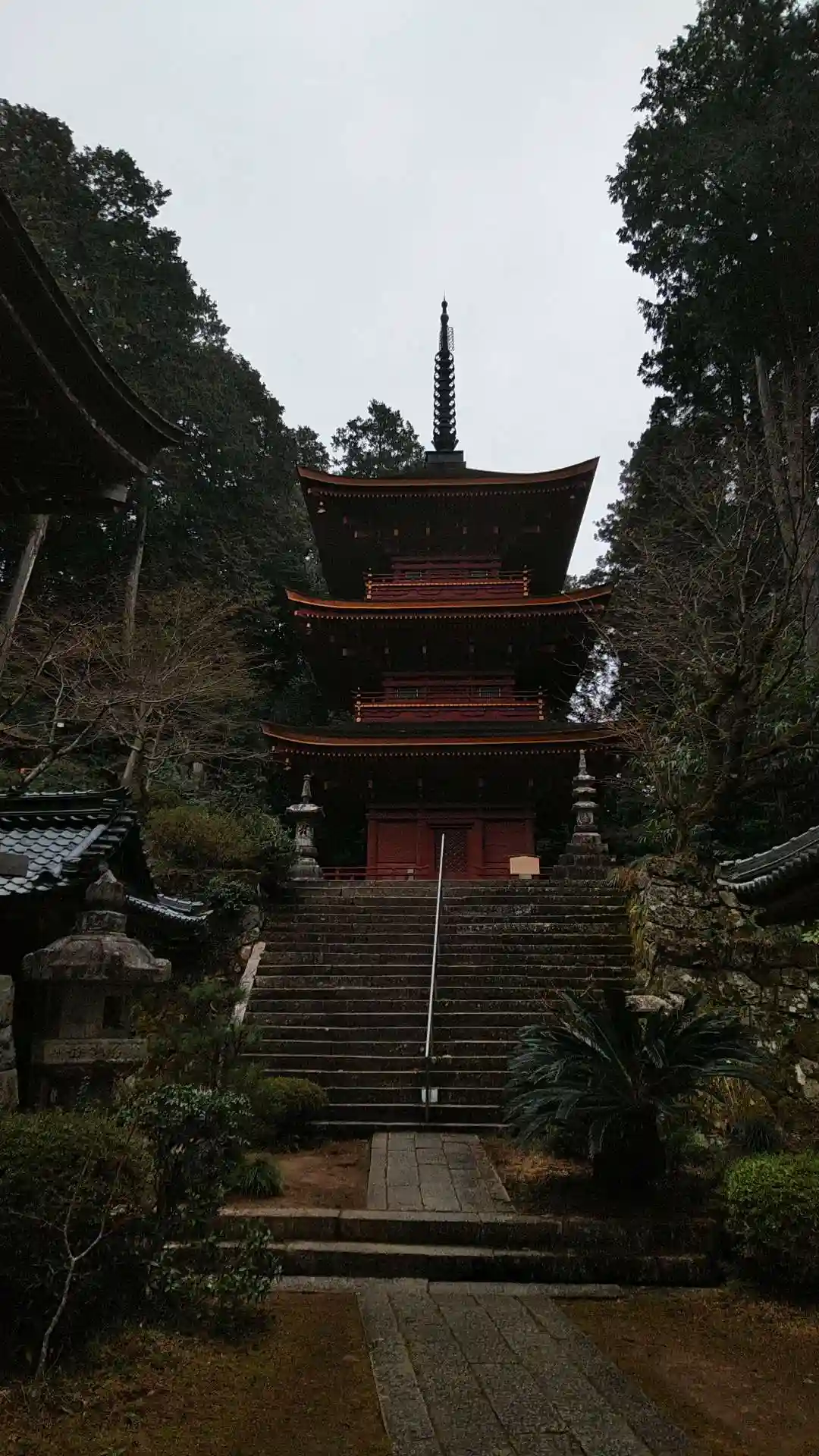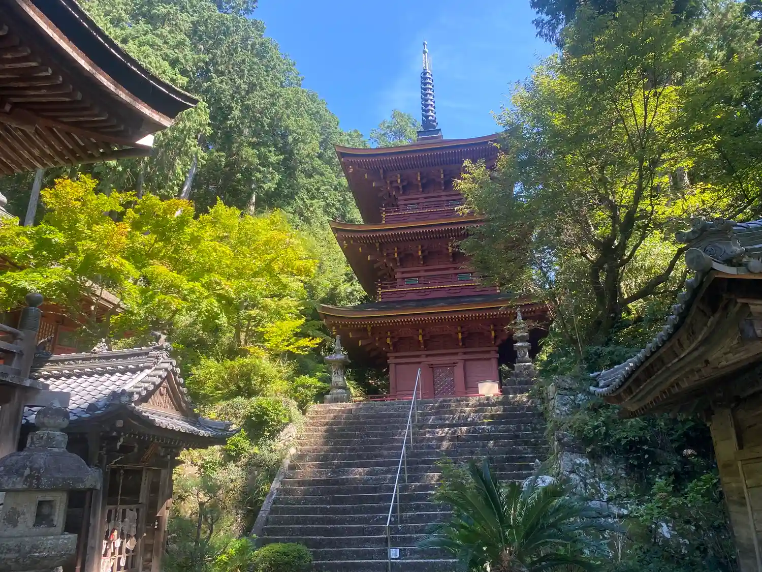 先に<三重塔>に参る。桃山時代の1589年から1597年にかけての再建。三間三重塔婆、杮葺、各重とも高欄付の縁を廻し(初重四隅のみ疑宝珠付)、外部は総丹塗り。高さ24mあまり。国指定の重要文化財。