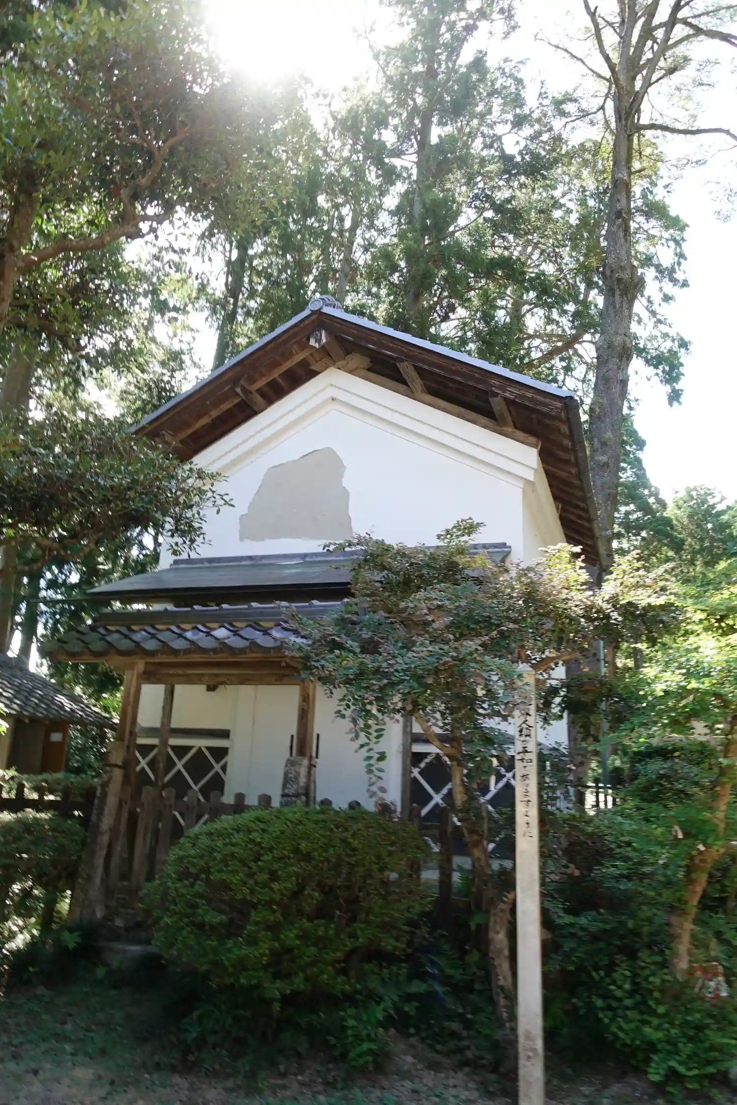 左側に古い瓦が載った白壁がありました。