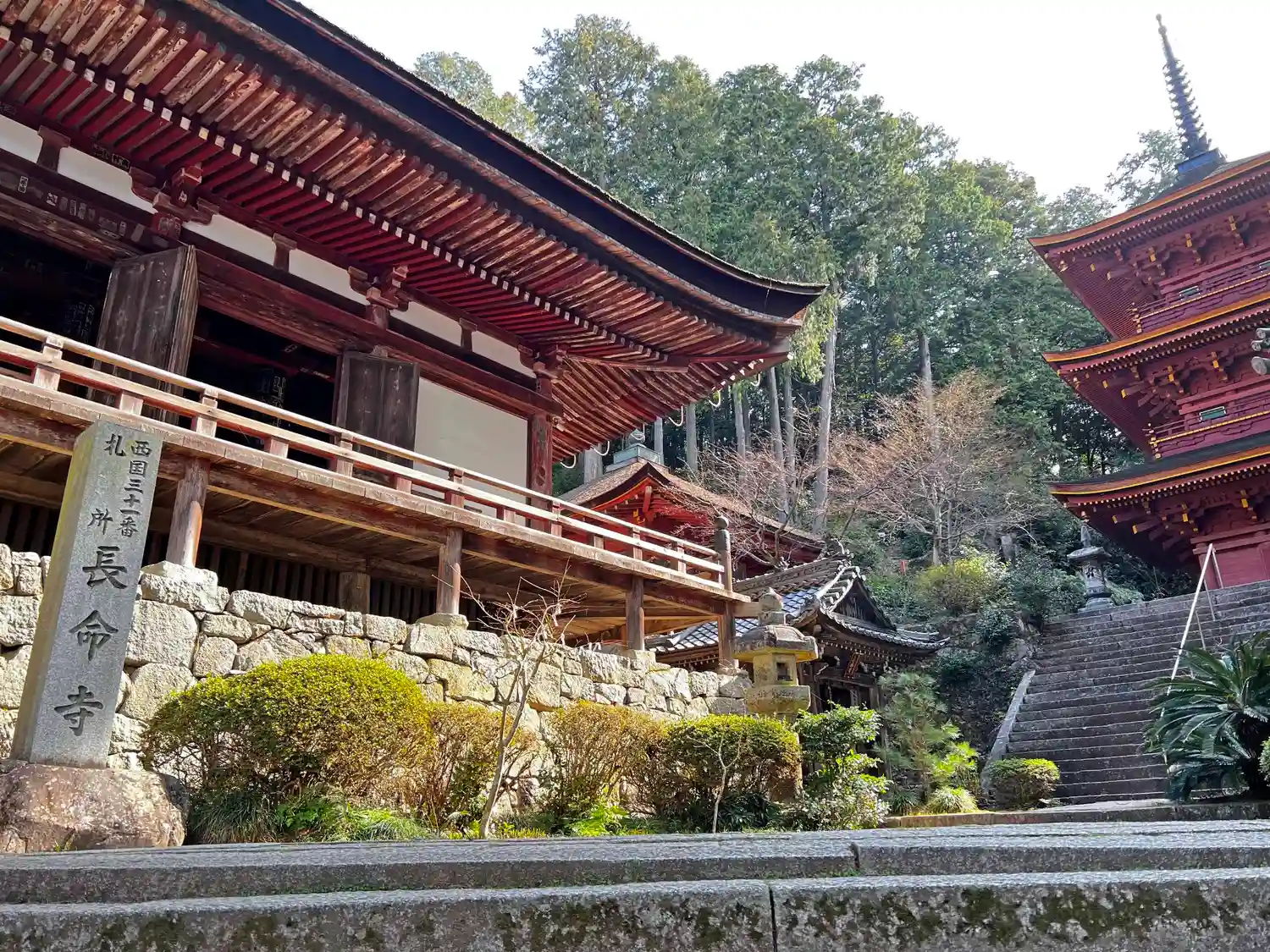 階段を登り切ると<寺号標>がある。左は本堂、右は三重塔。