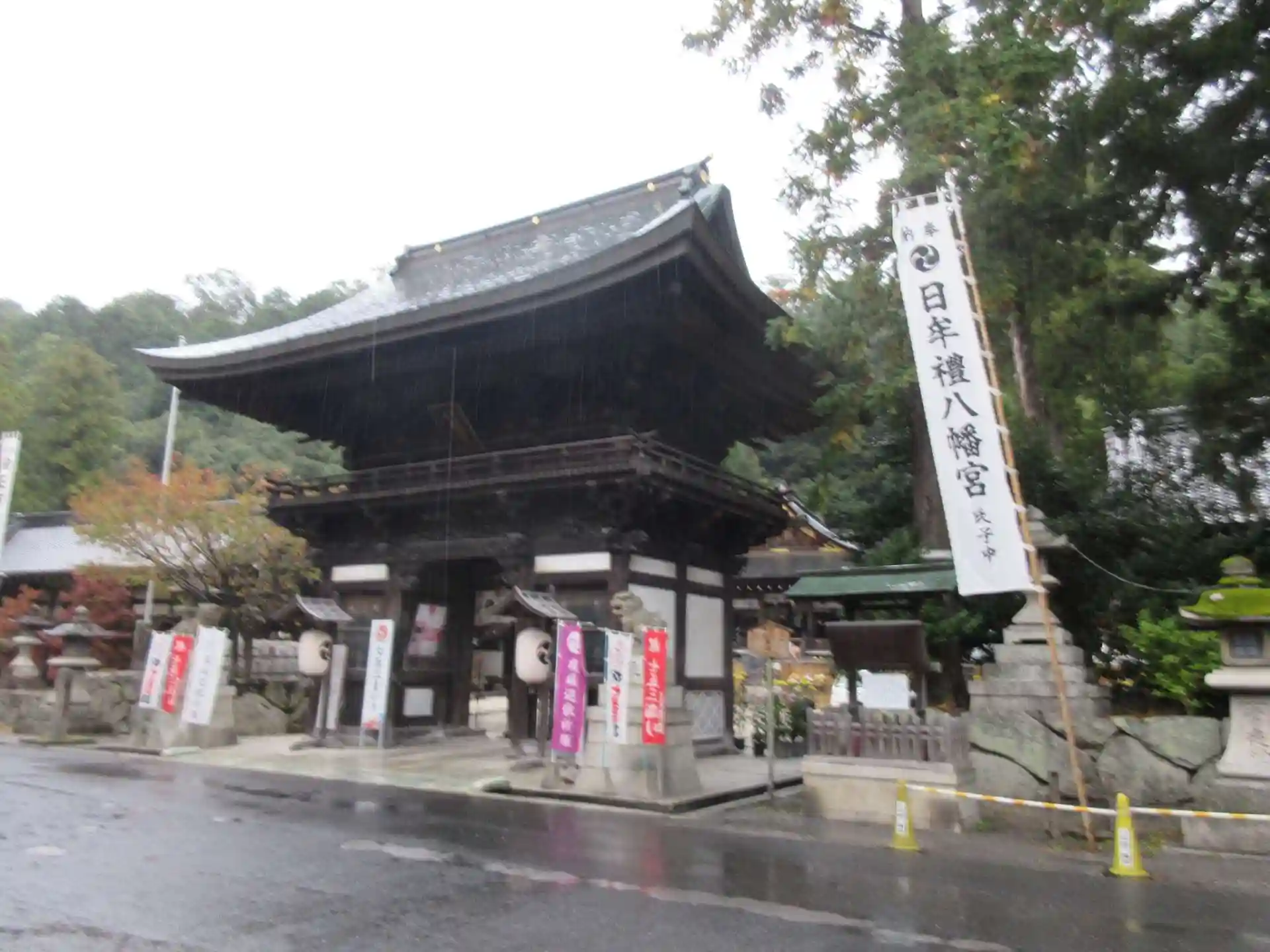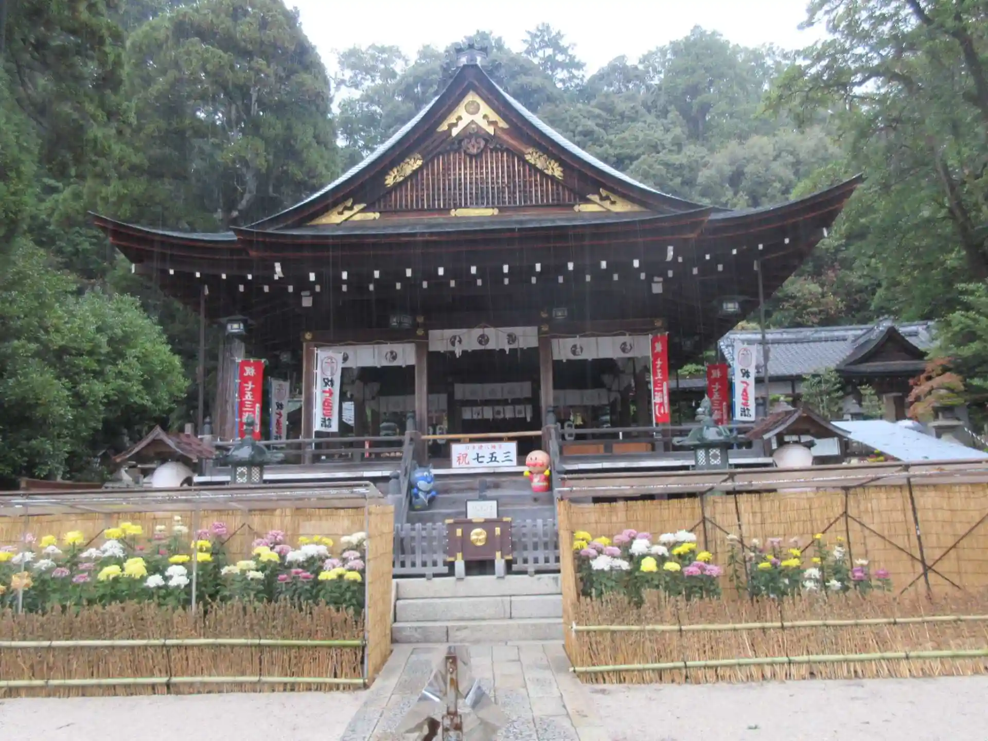 雨の中の参拝。境内はちょうど菊まつりの準備中でした。