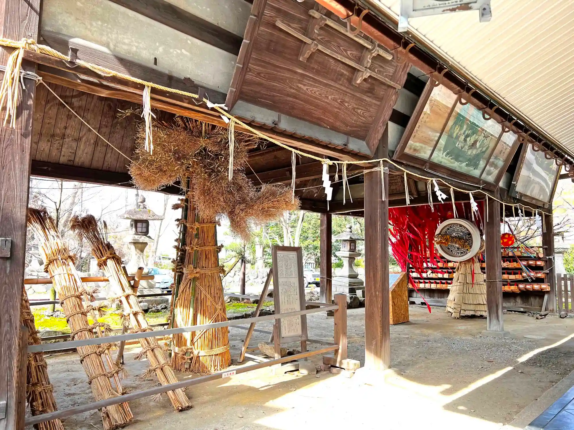上部には絵馬が飾ってあり、下には「八幡祭り」で使用する「ひきずり松明」などの奉納品が展示されている。