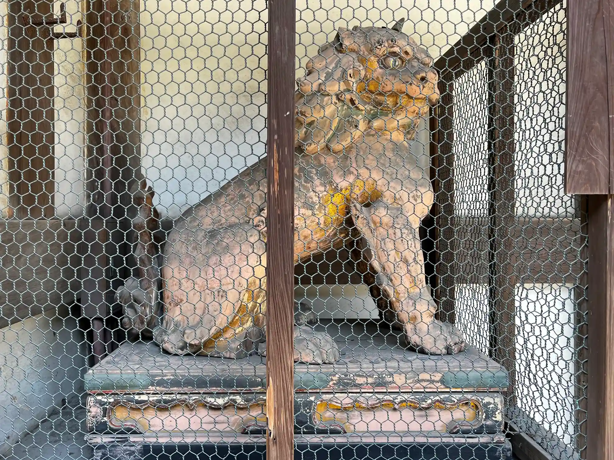 対をなす神門裏側の<狛犬>。台座とともに木製かしら。