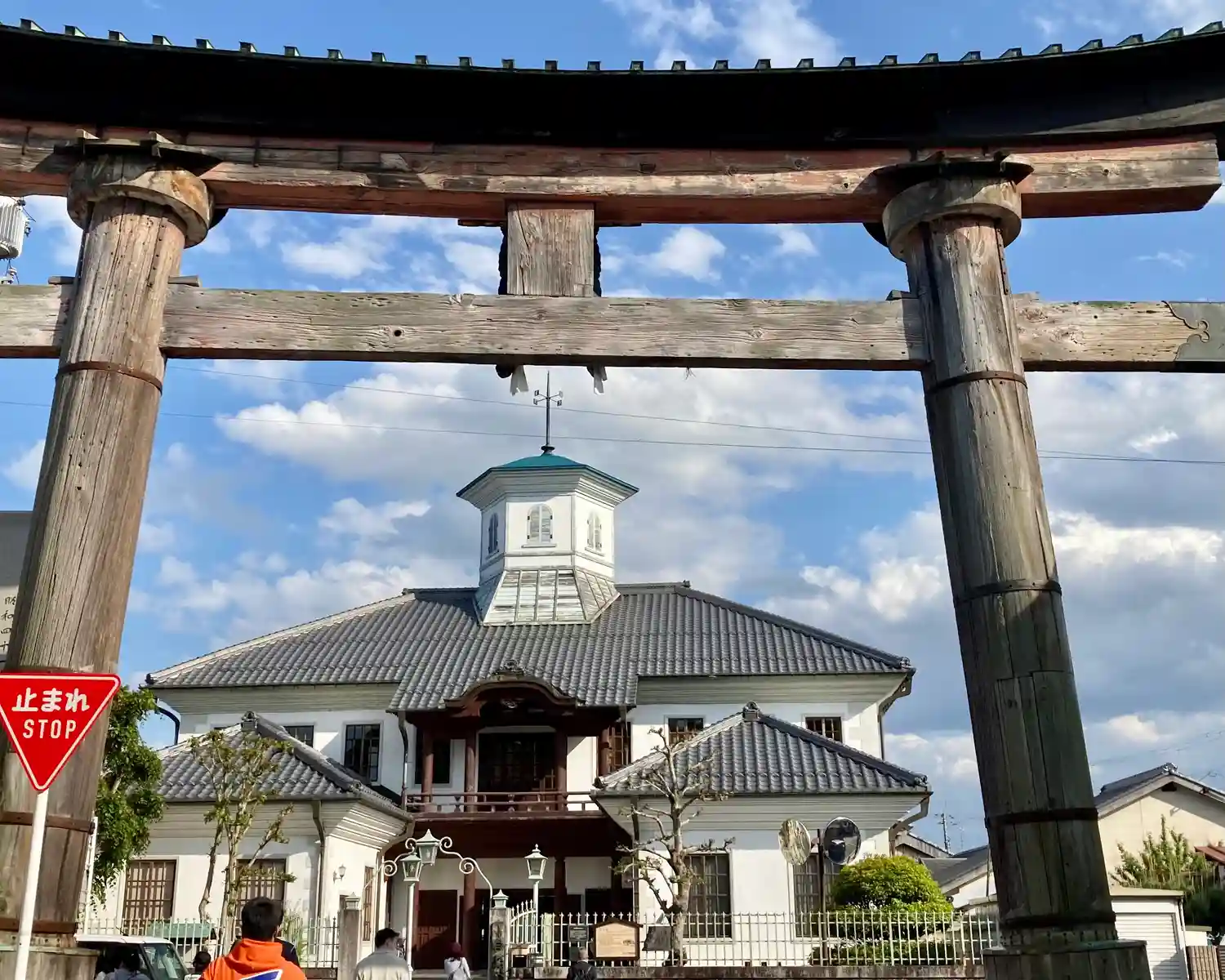 近江八幡の地名の由来になった神社。 鳥居に屋根がついているのが面白い。