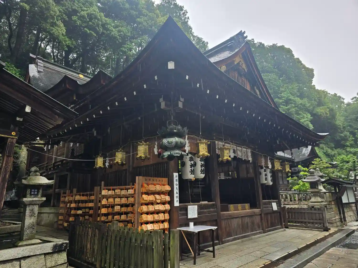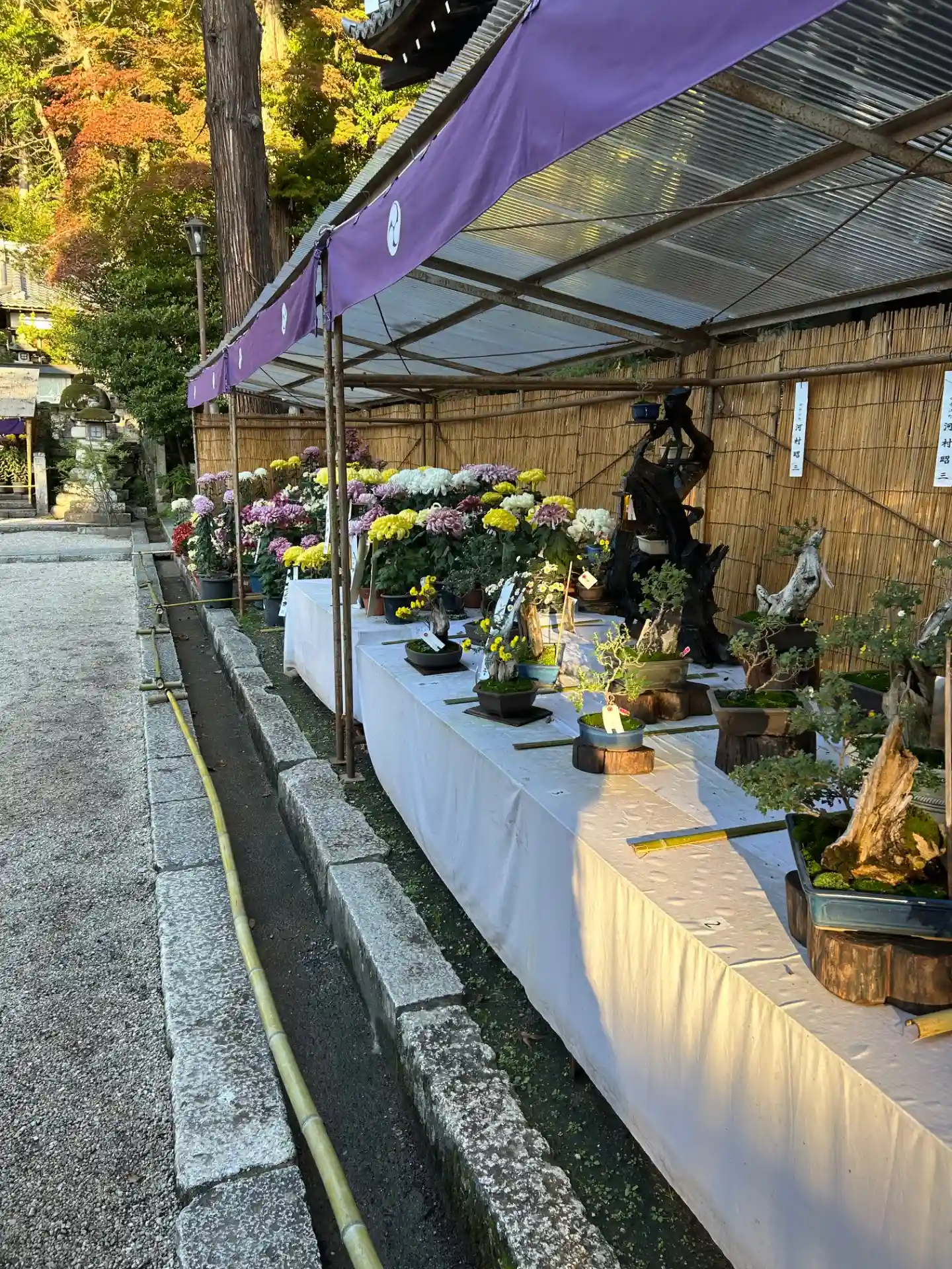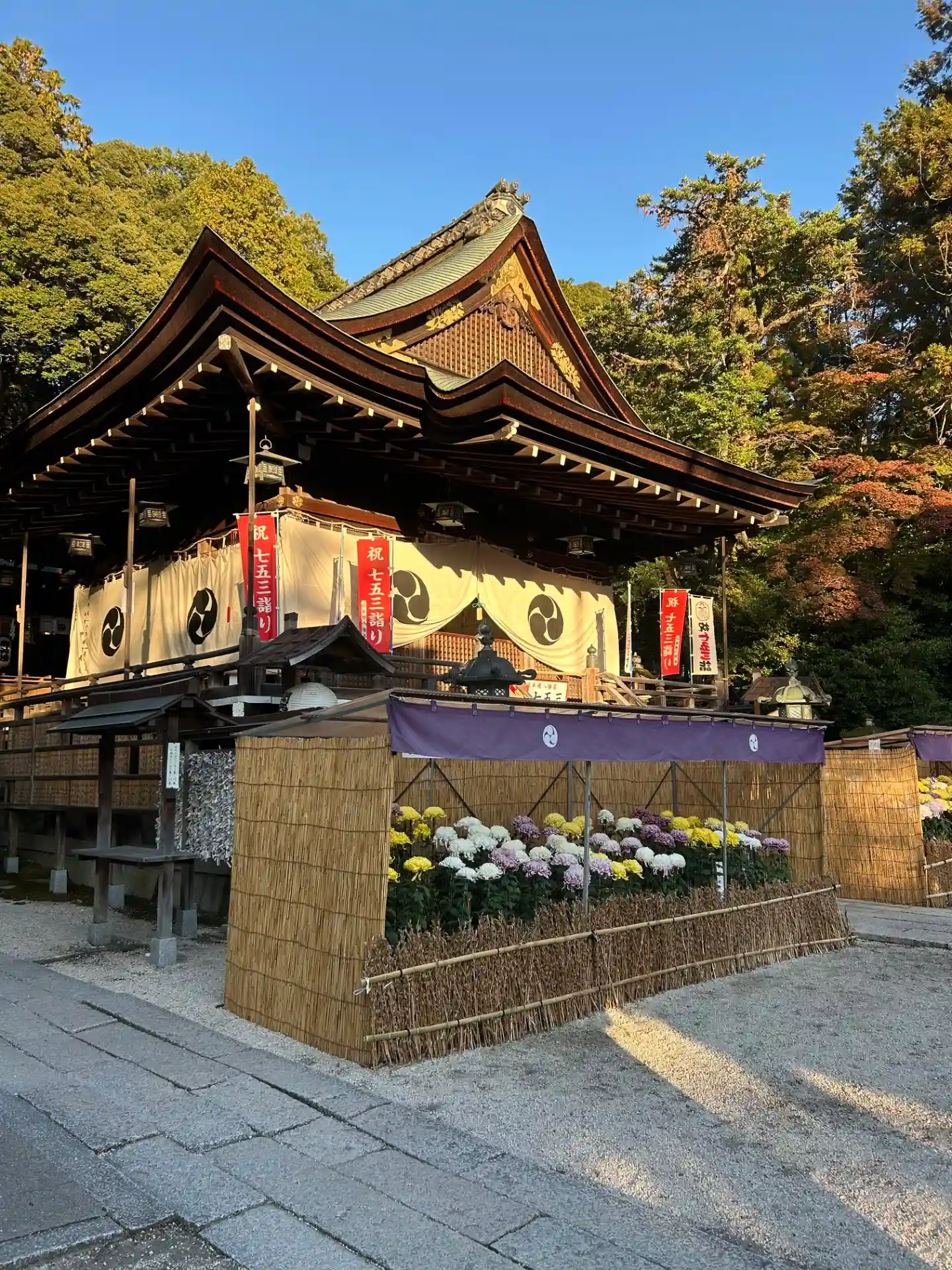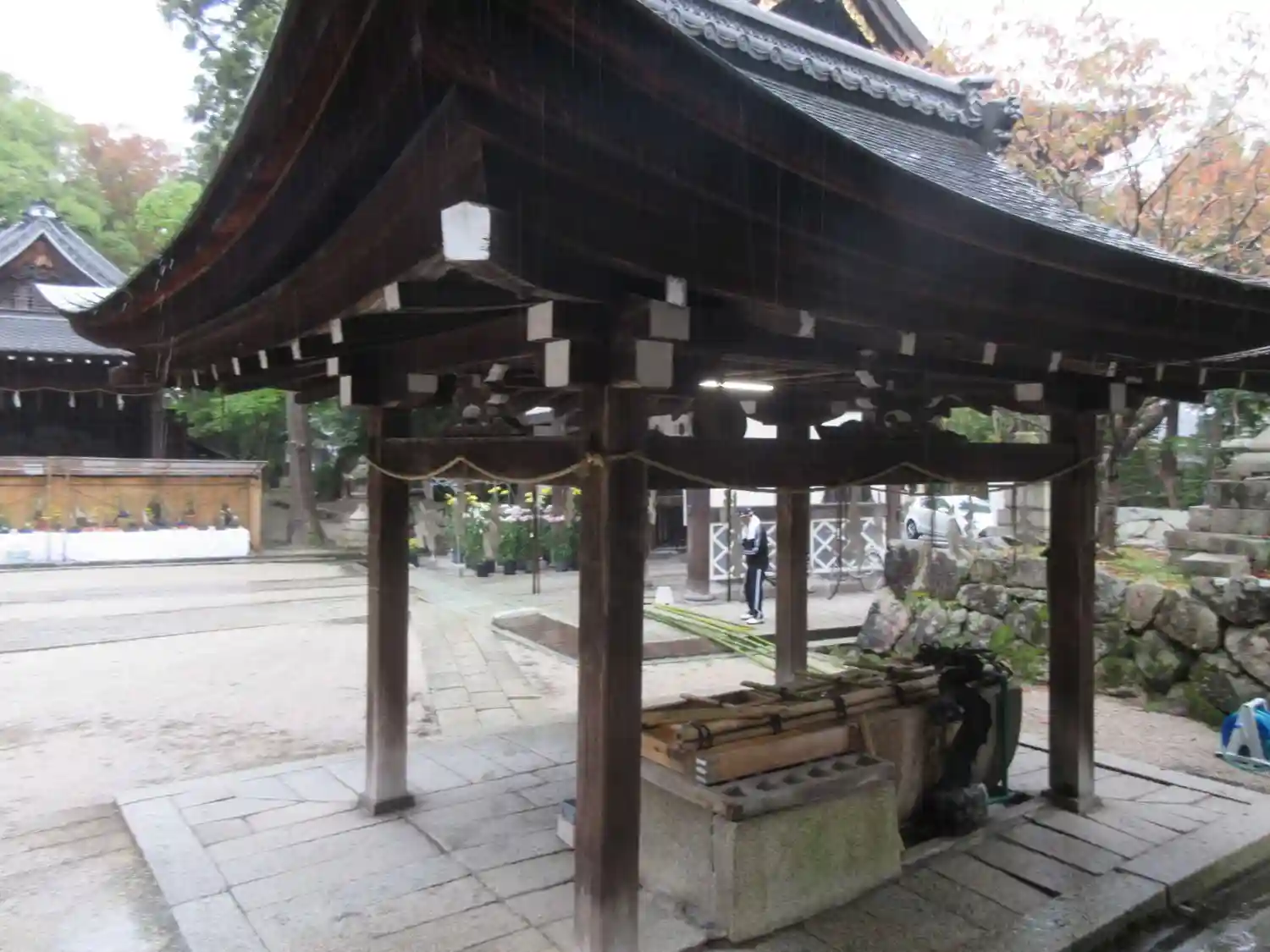 雨の中の参拝。境内はちょうど菊まつりの準備中でした。