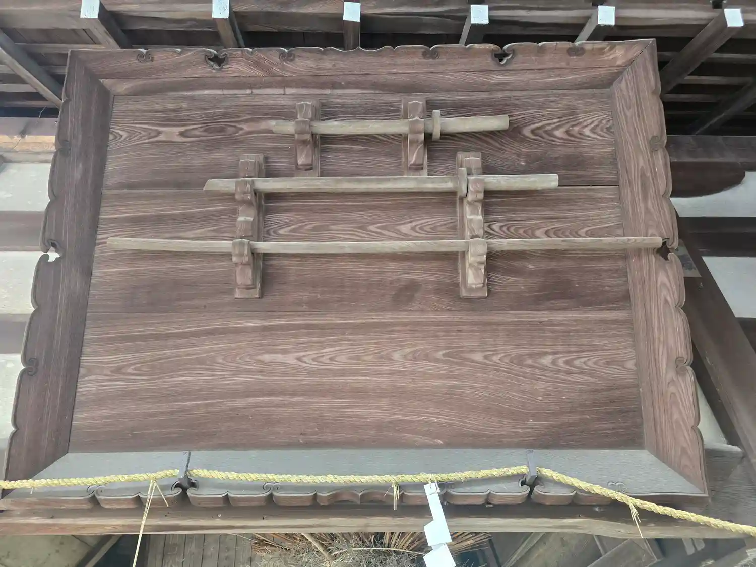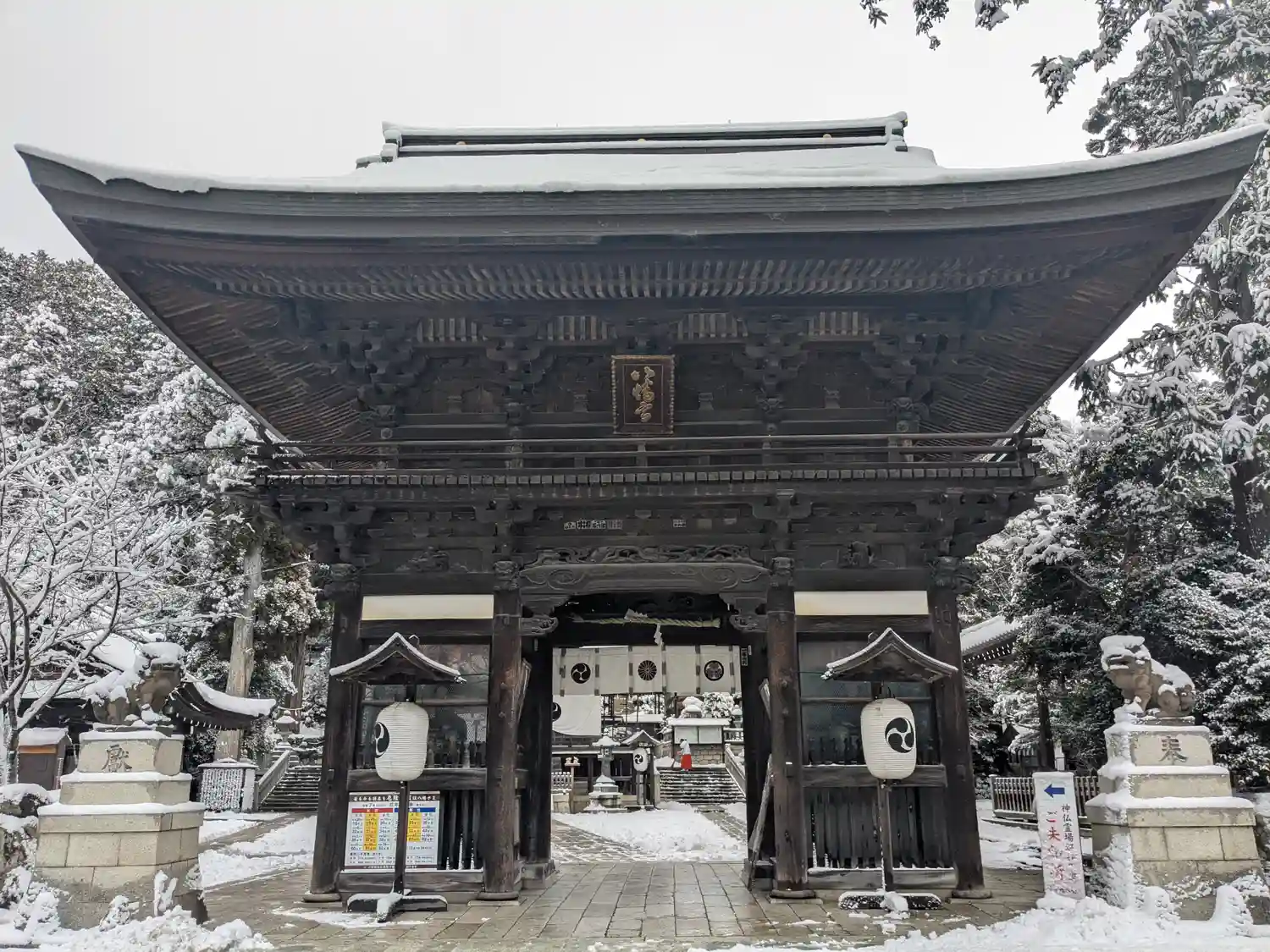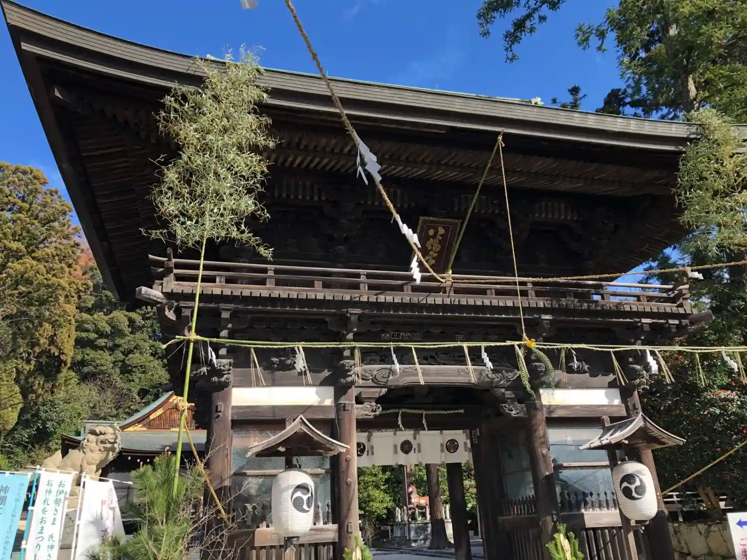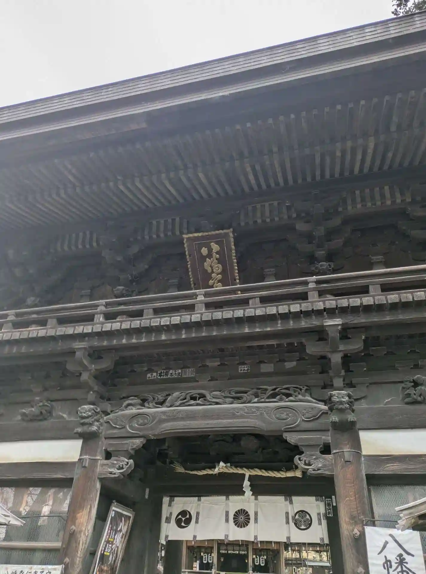 八幡さんのご神紋である「三つ巴」と徳川家の「三つ葉葵」の家紋が施された門の裏側。