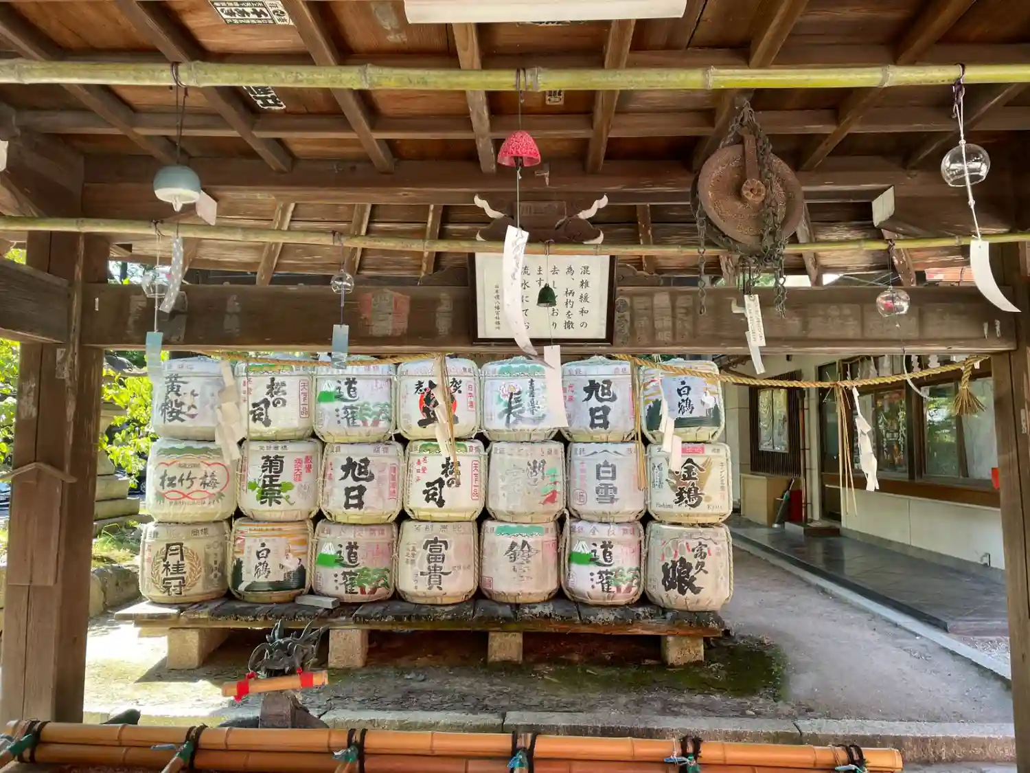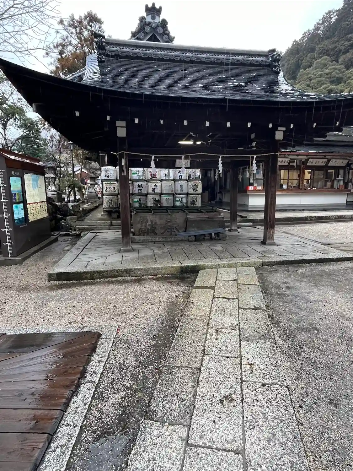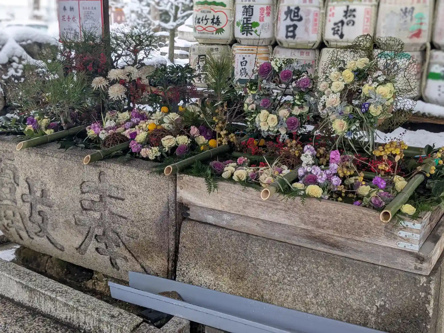 花手水になっていました・・・いやーお正月って感じですね。その奥には酒樽がたくさん・・・