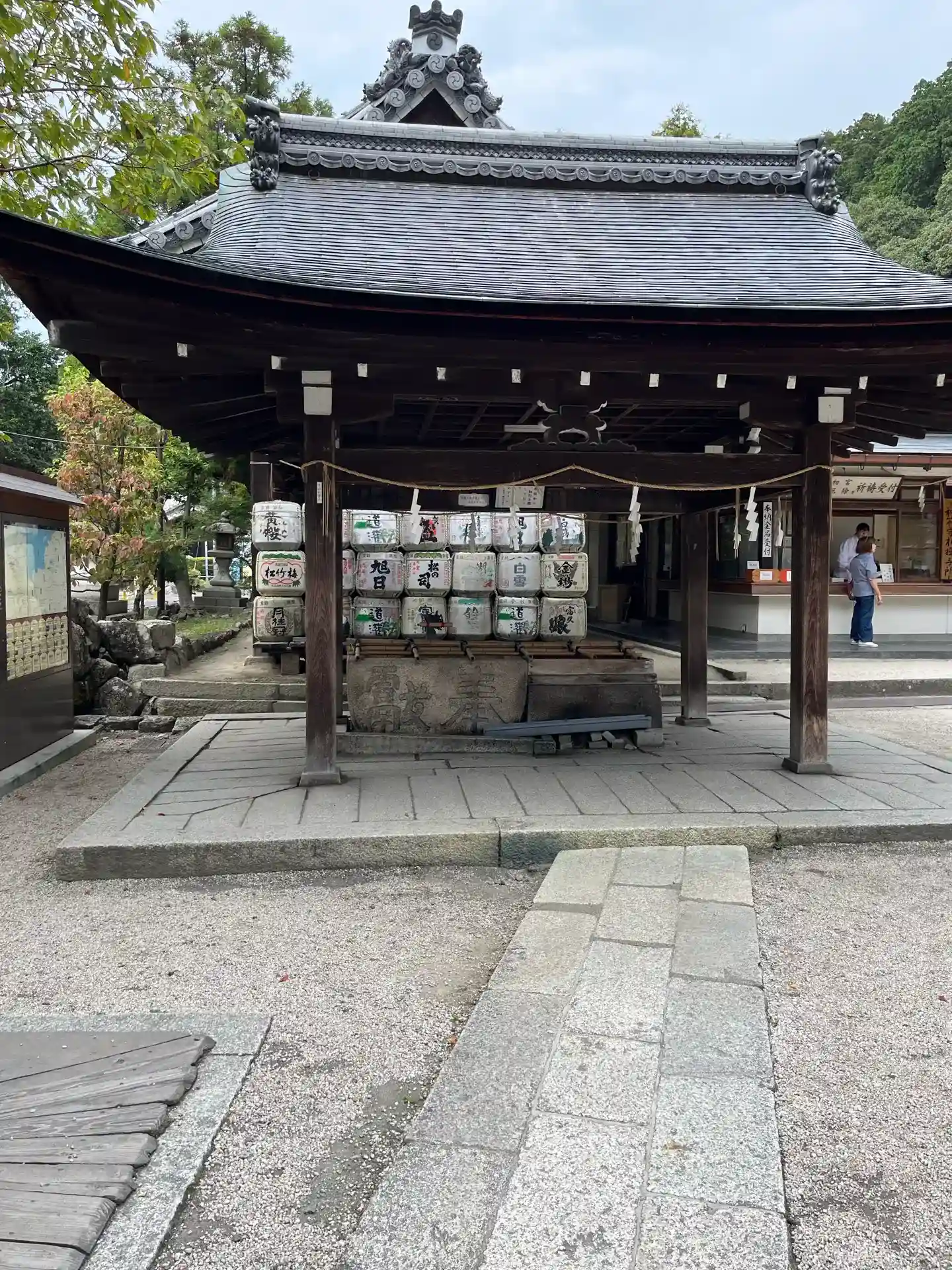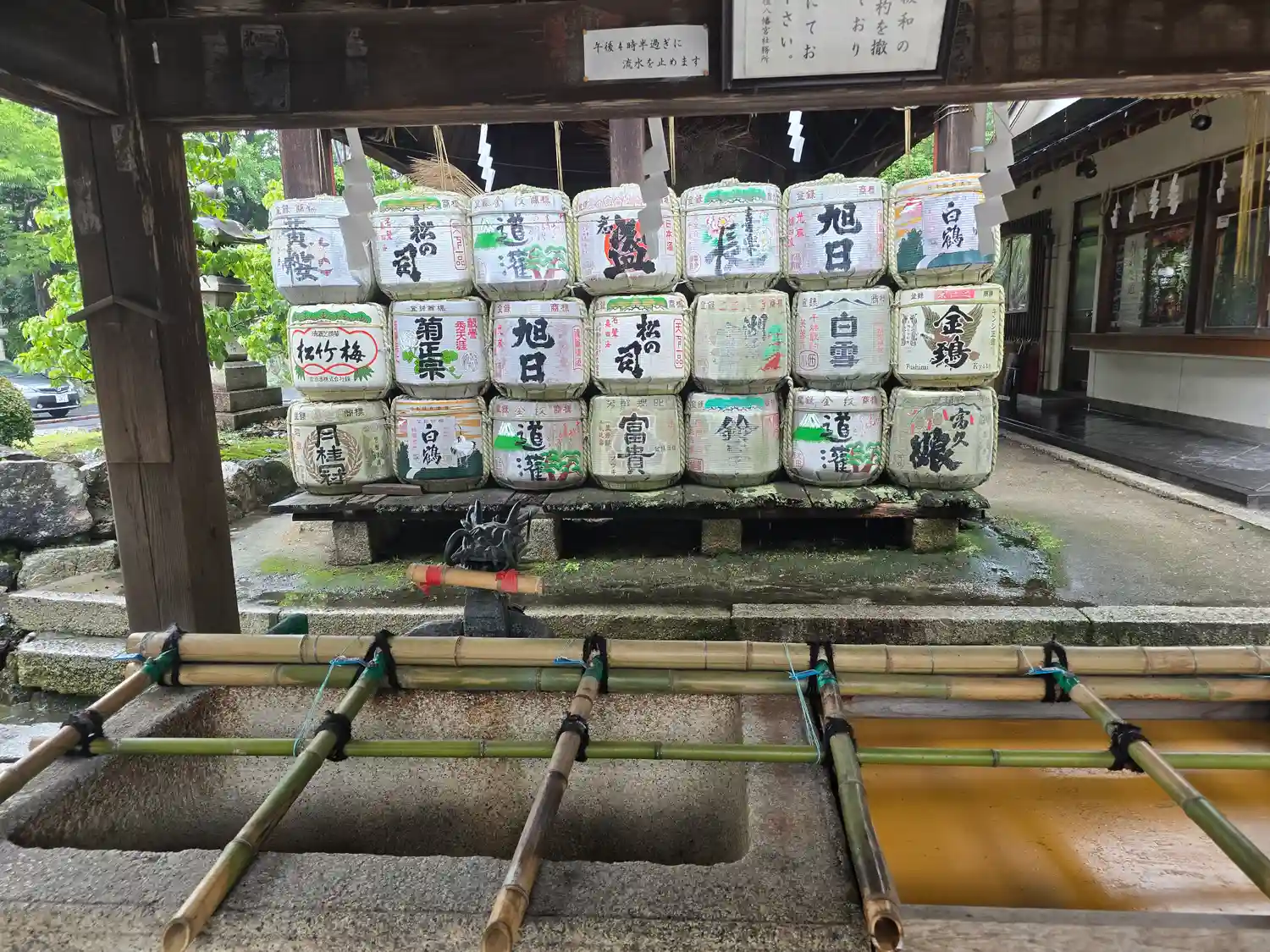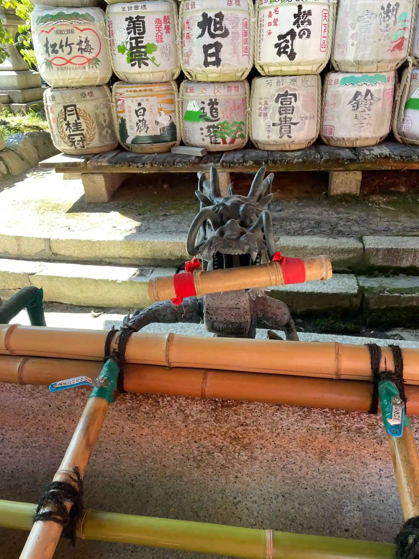 花手水になっていました・・・いやーお正月って感じですね。その奥には酒樽がたくさん・・・