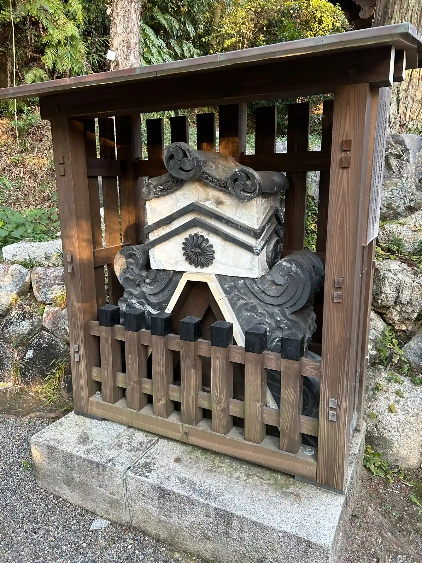 秋葉神社・愛宕神社の右側にある<本殿屋根棟鬼瓦>。今では再調達不可能な「八幡瓦」。2018年の台風21号で落下破損したもの。