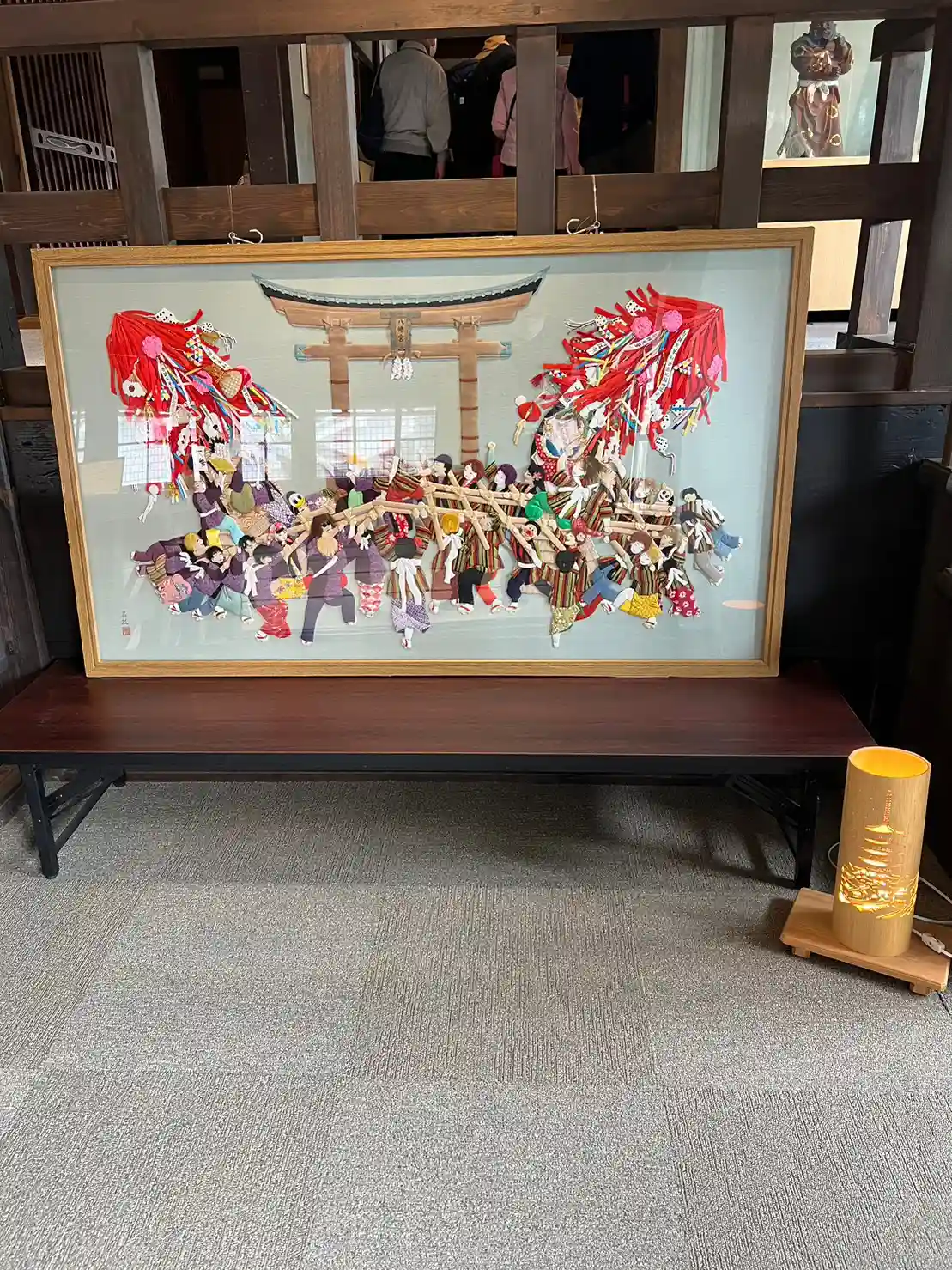 上部には絵馬が飾ってあり、下には「八幡祭り」で使用する「ひきずり松明」などの奉納品が展示されている。