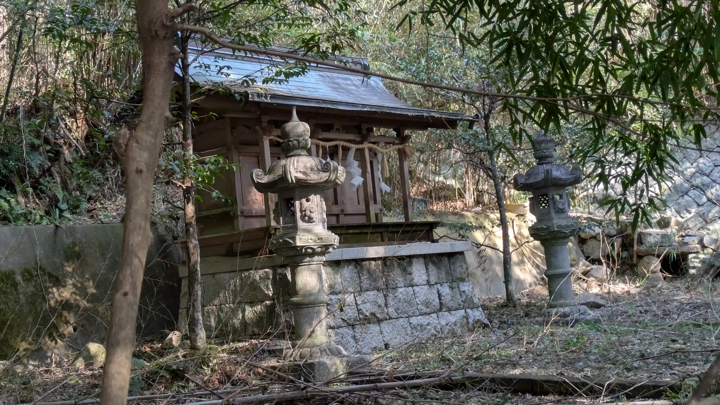 長命寺参道から東へ向かいGoogleMapでお見掛けした「山之神」社へ。階段参道と石鳥居があり、さらに進むと石塚がありました。日吉神社由緒の境外社に記載があり、御祭神は大山津見命。まあ山之神なのでそうですよね・・・😅ただ、さらに右奥の方に稲荷社の小祠と御祭神不明の三社殿がありました。さらに右手に階段の参道があり、入り口には梵字:キリークの彫られた石標。梵字以外が全く読めなかったのですが阿弥陀さんが祀られているんでしょうか?少し上っていくと地蔵様が居られましたが、その先に「急傾斜地崩壊危険区域」の標識があったのでやめときました😅