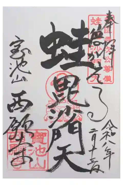 予習せずにお詣りするのはなかなか罪なもので・・・😅北の駐車場から本堂前へ。時間も時間だったので…と思ったら本堂の戸に「ご自由にお参りください」とあったのでありがたく😊立派な阿弥陀三尊を拝んでふと左手を見ると色鮮やかな毘沙門天、そしてその前には「西願寺開基豊臣秀次公尊像」とありました😲そのお隣には見覚えある秀次公の肖像と毘沙門天(毘沙門天発遣図・刺繍)があり、さらには涅槃図とその横には御朱印の文字😍これはと思い庫裏へ向かおうとしたら女性の姿が😲お声がけするとどうやらお母さまなのかな?御朱印をお願いするとお引き受けくださいました😊写真も撮らせてもらってよいか確認するとこちらもOKとのことでありがたく😍当然このお寺の歴史からして秀次公が拝んだ阿弥陀様ということになりますね😊信長公開基の阿弥陀様に始まり、秀次公開基の阿弥陀様で締めるというなんとも贅沢な一日😅御朱印を拝受し、お話を伺うと御朱印にも書かれている毘沙門天は秀次公念持仏で小牧長久手の敗戦時に作られたそう。秀次公が高野山で切腹したときには飛び立ち、西方極楽浄土まで秀次公の魂をお連れしたと伝わるそうです。靴の模様がカエルみたいなので蛙毘沙門天とも呼ばれているそうです。ご住職は嵯峨釈迦堂清凉寺に御勤めに出ているそうで嵯峨釈迦堂談義でも盛り上がりました😊でも秀次公開基のお寺の住職が豊臣秀頼公の首塚がある嵯峨釈迦堂にお勤めとは何かの因果なのでしょうかね・・・😅すっかり話し込んでしまい、気が付けば17:30周ってました😱喋り足りてないところでもありましたがまたの機会にということでお暇を。山門出るまでご丁寧にお見送りいただき恐縮の限りです😅