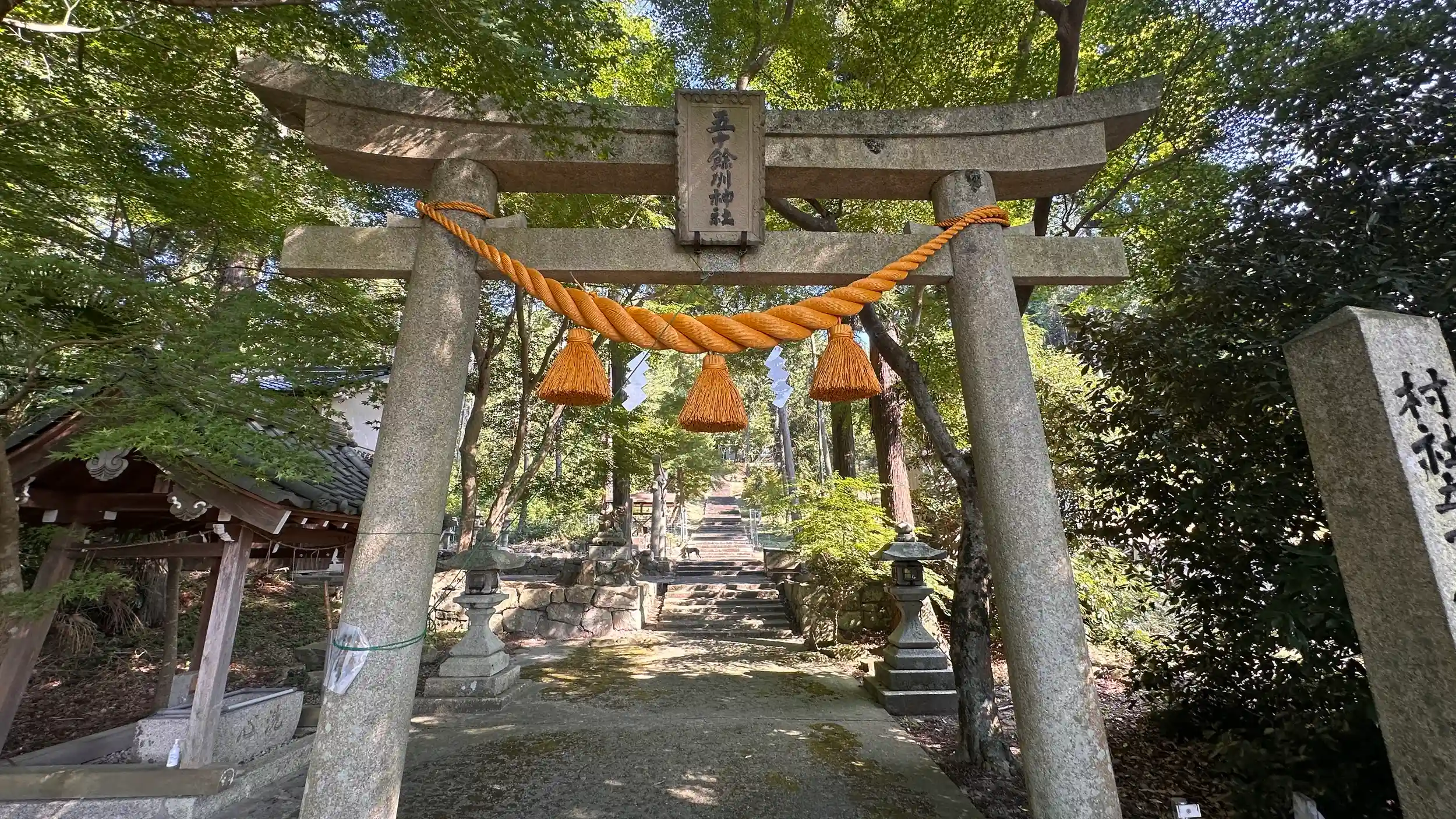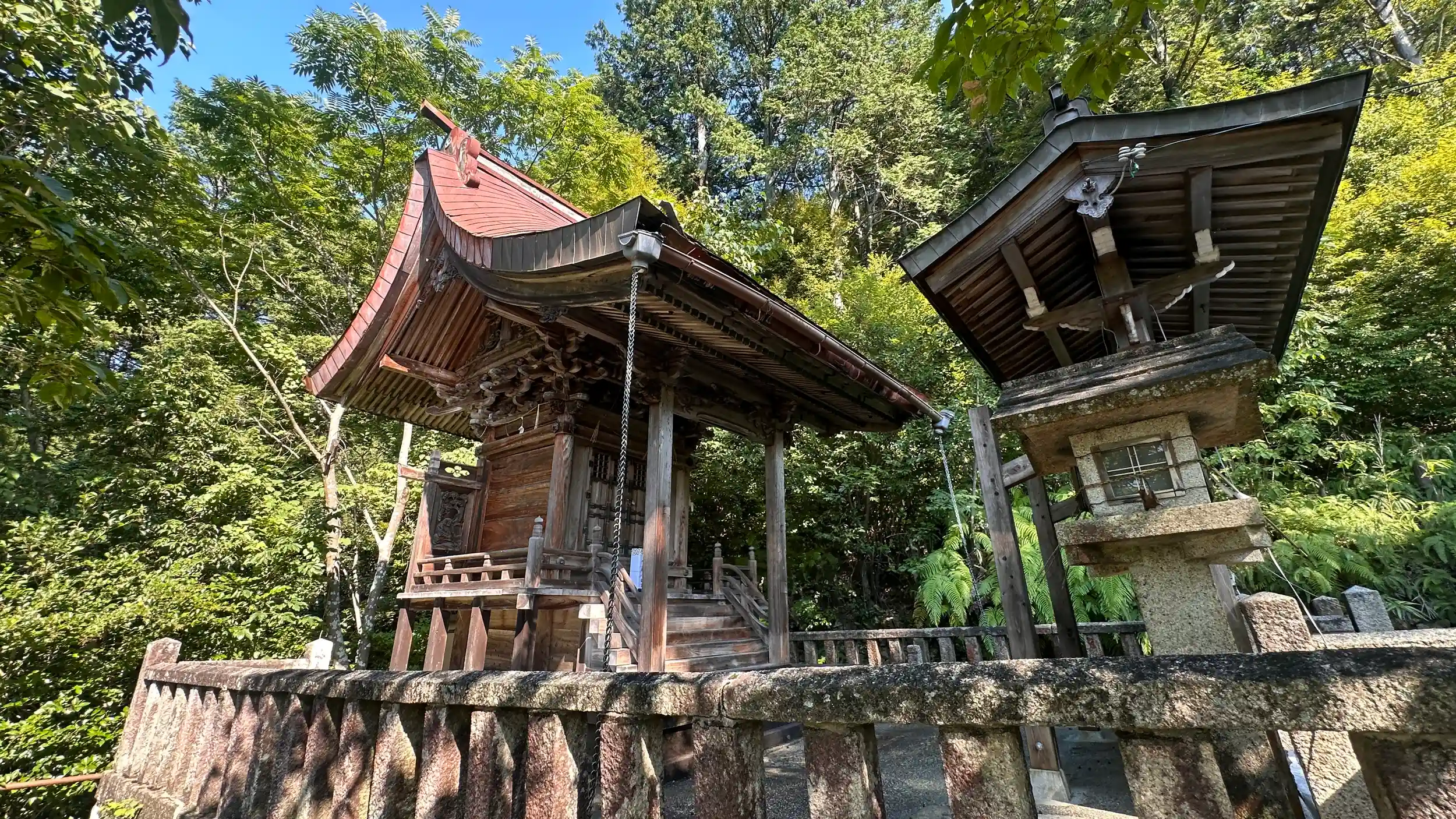 御祭神は、佐々木六角一族五十余人之霊神、織田信長が将軍・足利義昭を擁して上洛の折、信長軍と佐々木六角氏と戦いになり、敗れた佐々木六角氏の家族・家臣50余人が須田川原で自害し、その御霊を祀っているといいます、本殿は一間社流造。長い階段の参道の途中には 「天満宮」「愛宕神社」の境内社もありますさらに繖山へ登った中腹に鎮座されています。拝殿からは参道から集落まで一直線に伸びているのがよくわかります。