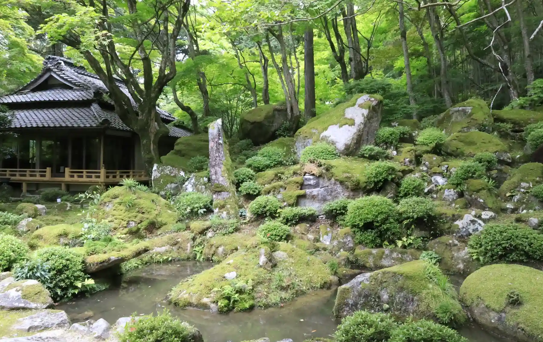 ぱらつき始める雨のなか、青葉の色づき鮮やかになるひととき。