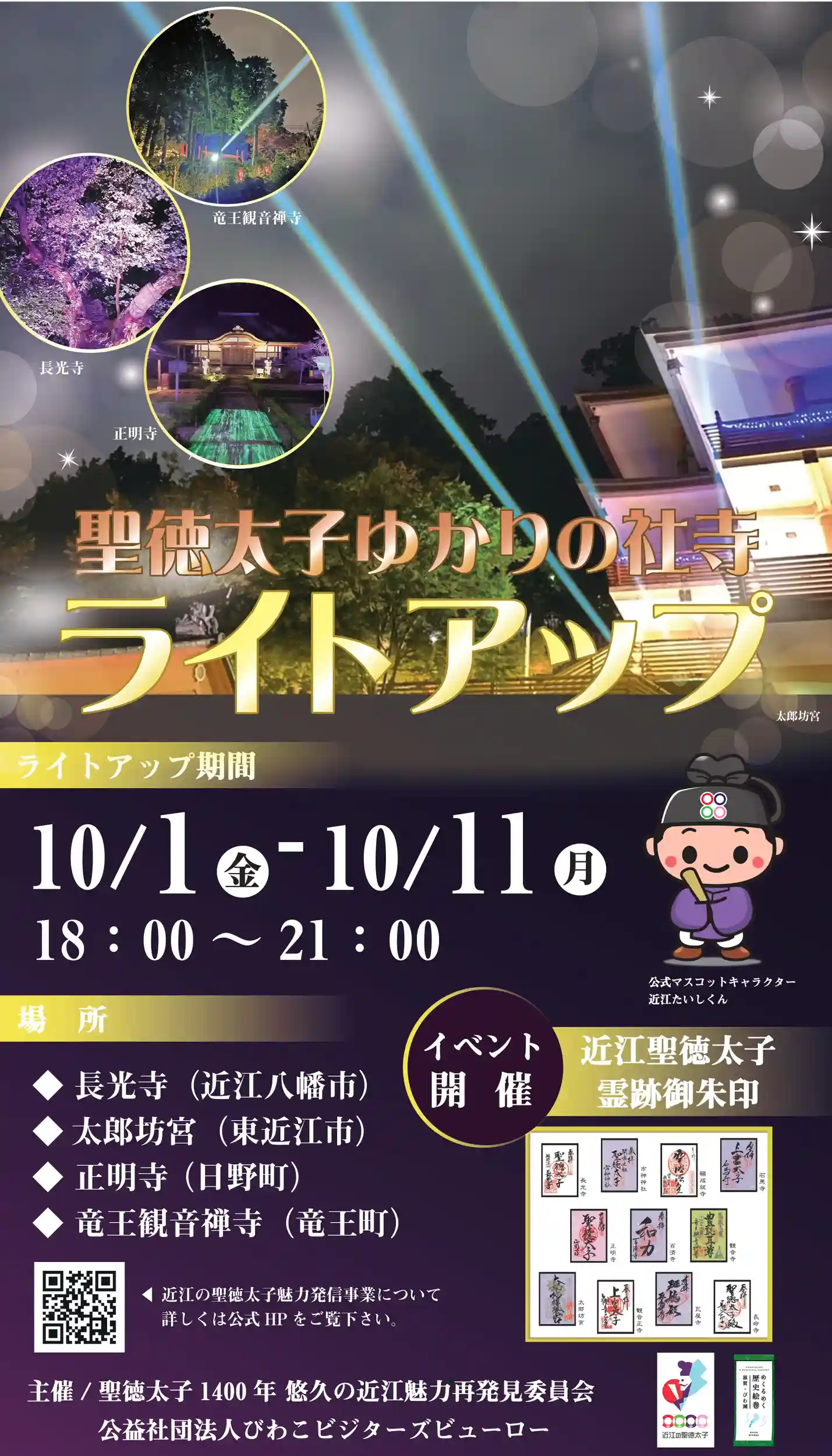 近江は聖徳太子にゆかりの有る社寺が奈良や大坂を凌いで遙かに多い。聖徳太子伝説を生みだした古人のメッセージとその魅力を地元の人々、ひいてはより多くの国民の皆さんに知って戴くため、そして、近江聖徳太子霊跡の特別御朱印の授与が10月1日から東近江地域の11社寺で一斉に開始したことを周知して戴く、東近江地域の二市二町を代表する4社寺で、レーザーサーチライトを一斉に天空へ向けて照射するとともに、境内をライトアップしています。