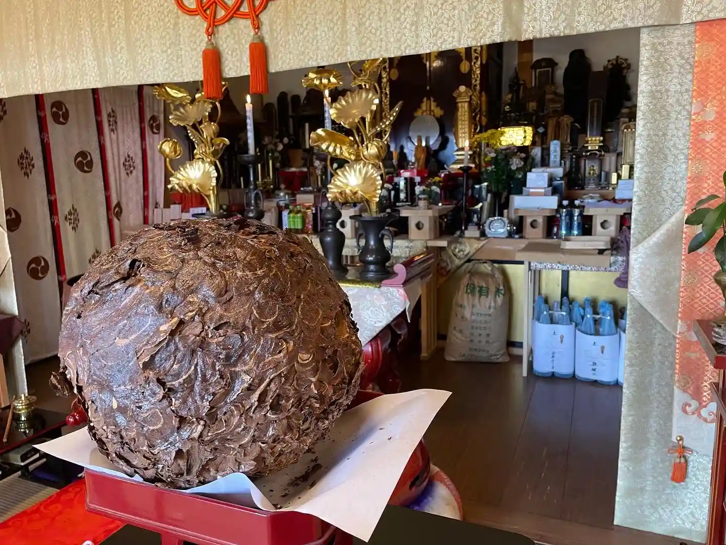 本日、新しく作られたお位牌と蜂の巣、そして供物を携えて従業員の方と共にお越しになり、蜂群および虫類の供養をさせていただきました。