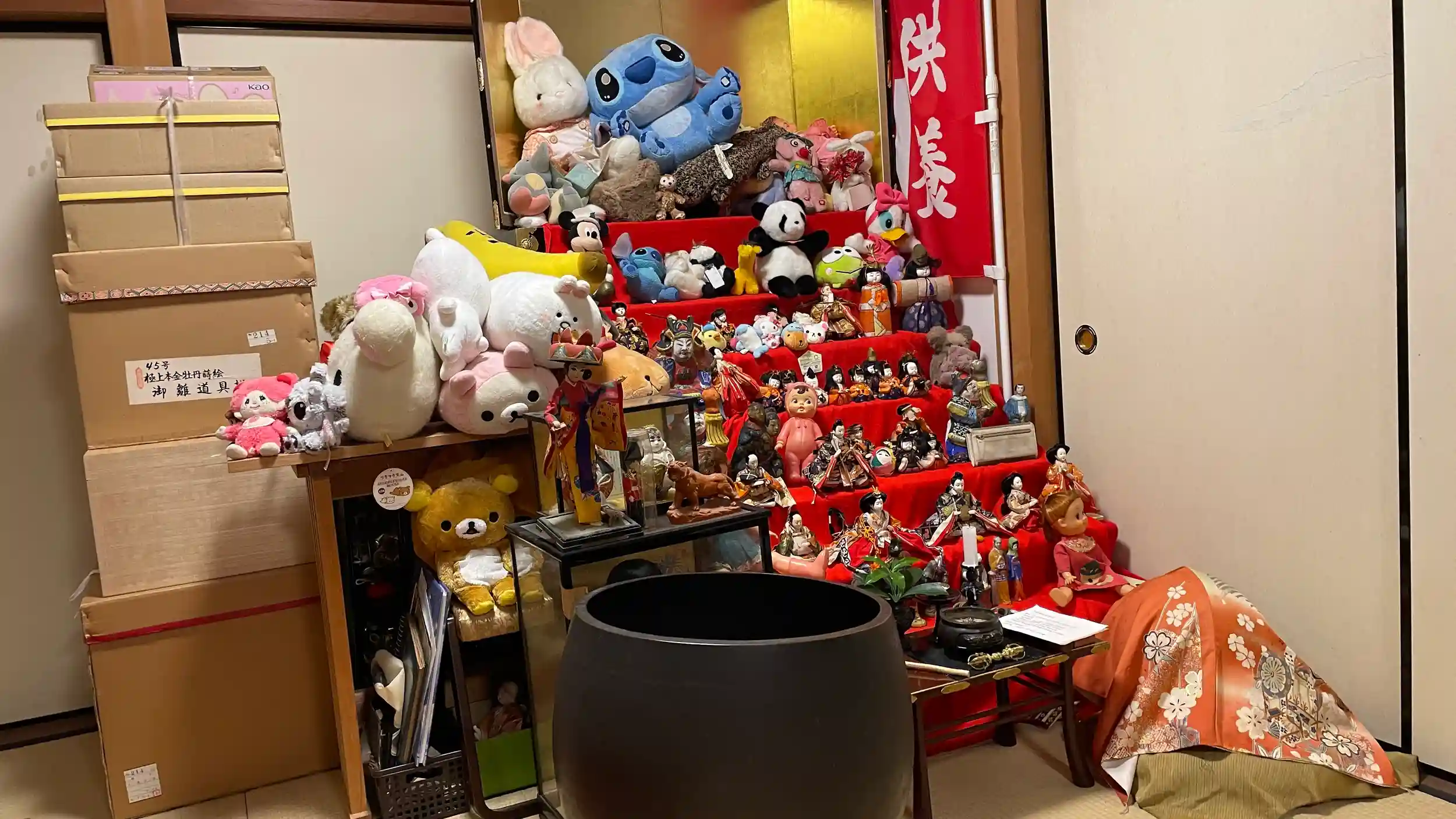 お祀りする場所が飽和状態。仕方なく梱包したままの雛人形は、場所が空いた後に雛壇に並べて、一ヶ月間毎日供養します。