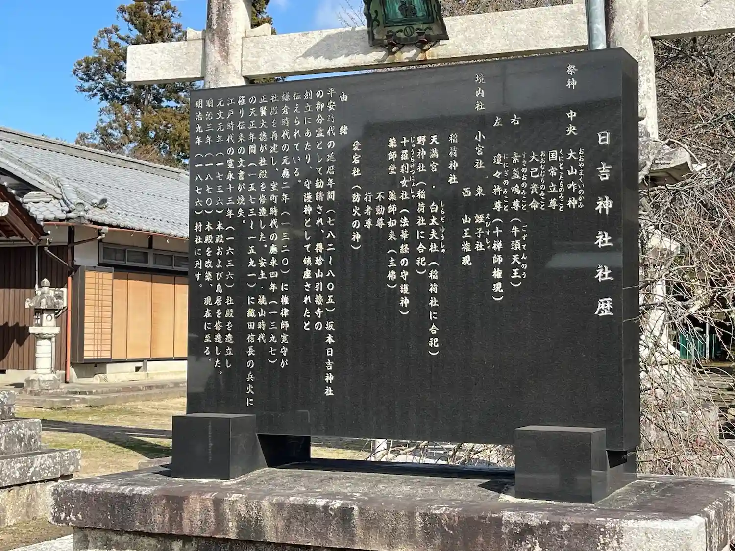 社伝によると平安時代の延暦年間(782-806)の創建です。比叡山延暦寺の寺領に開かれた得珍山引接寺の鎮守として、坂本日吉神社の御分霊が勧請されたのがはじまりとされます。室町末期には織田信長の侵攻を受けて、永禄年間(1558-1570)に現在地へと移転しました。