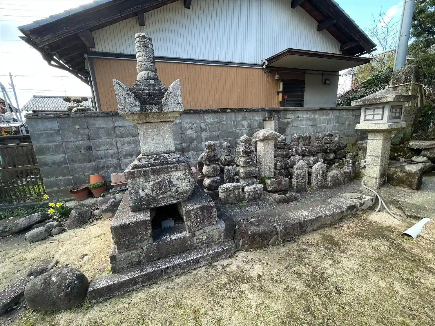薬師堂の前に庚申塔や石塔、石仏が並んでいます