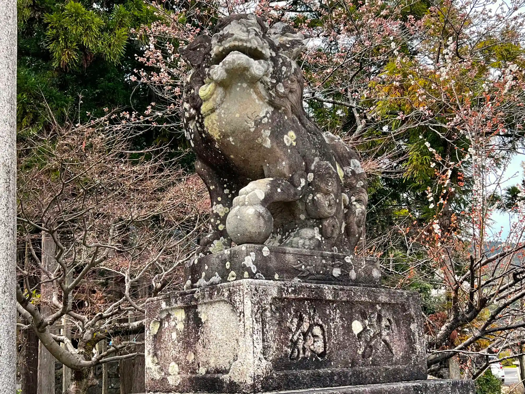 鳥居前右側の<狛犬>。補修が激しい。