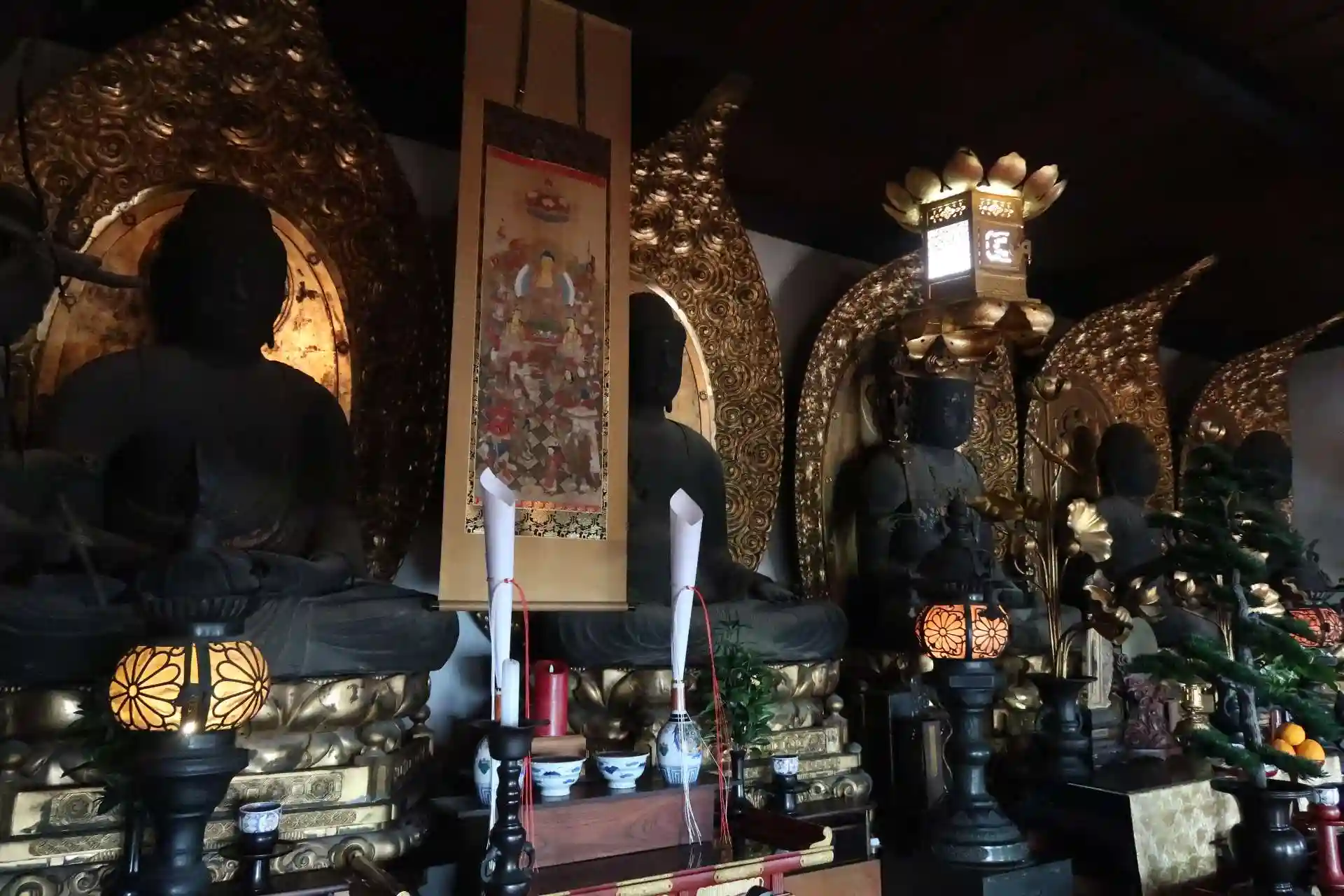 脇から内陣に入らせて頂きました。5躯の如来(五智如来)像を横一列に安置、壮観ですがとても窮屈そう。以前は四隅に四天王像を配置してありましたが、少しでも裕を取るため左右の手前に2躯ずつ下ろして並べたとの事です。創建時の本堂は相当大きなお堂だったと思われます。