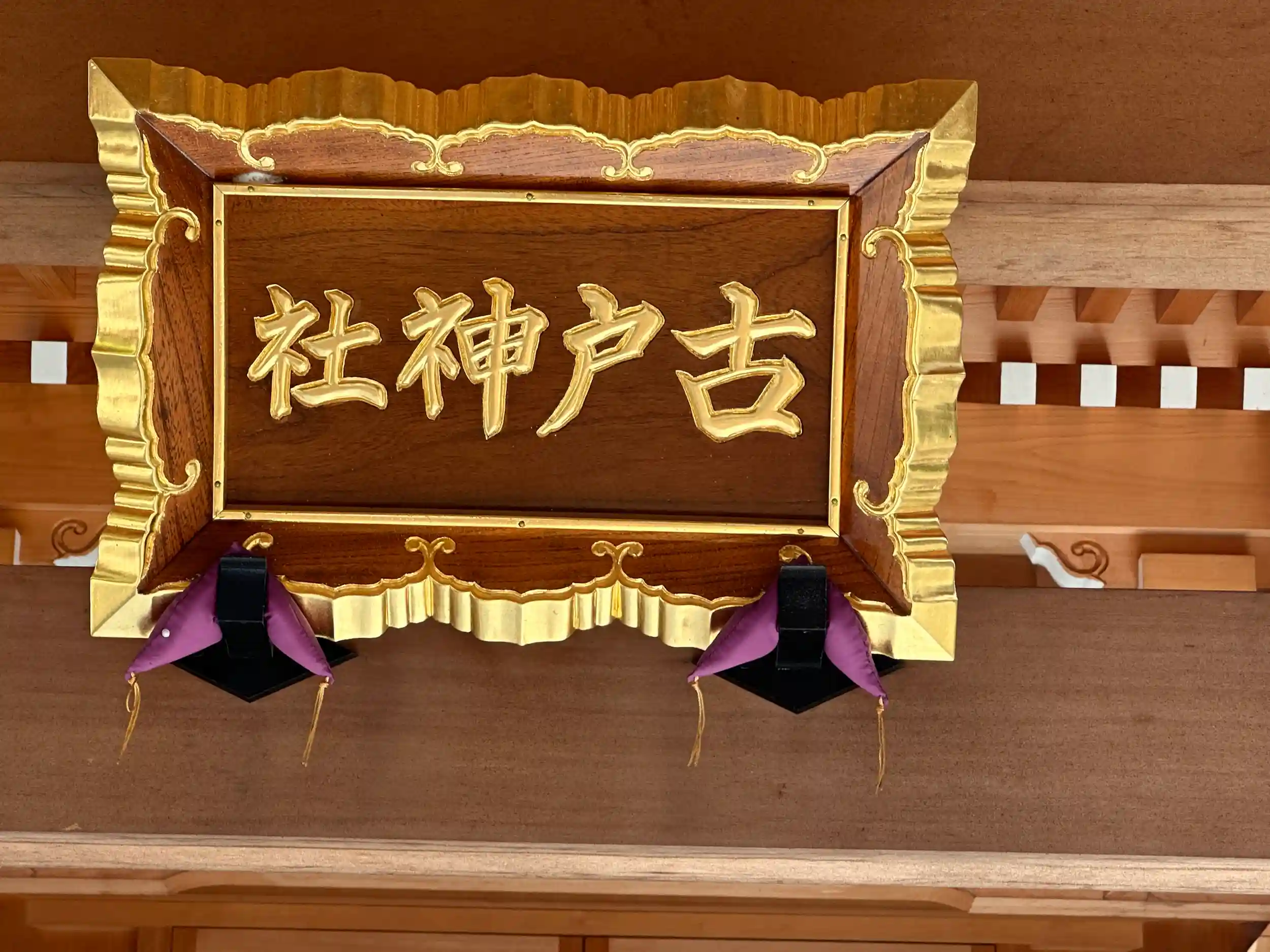 新しい扁額が眩しいです!正式名称は、古戸社「フルトシャ」です。本殿は、一間社流造 中里町の真ん中に鎮座されています、児童遊具もあり綺麗に手入れされています