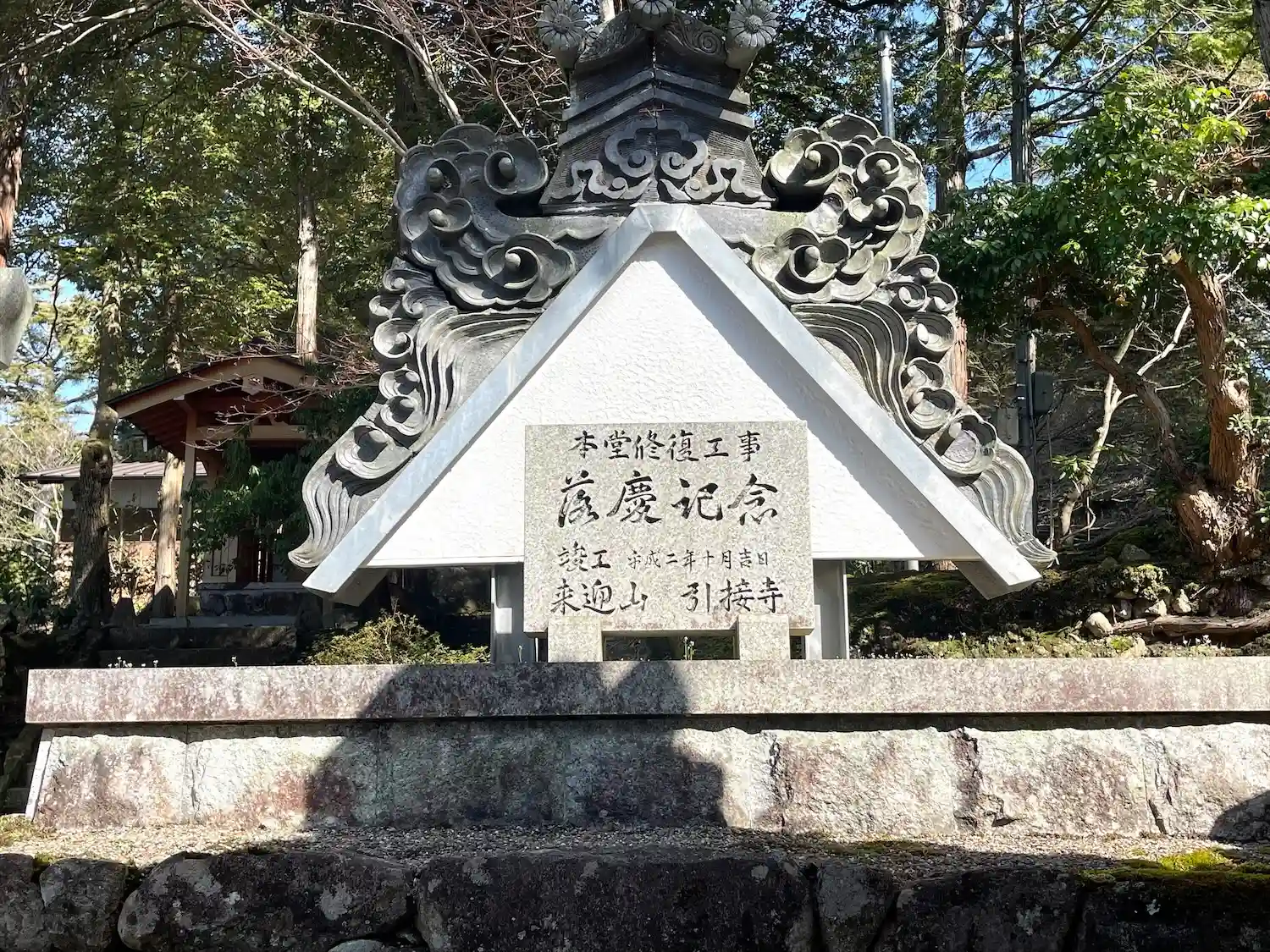 また、庭園の奥にある「来迎浄土」は付近の山野に散在していた石仏や石塔を集め、昭和61年に造られたもので、大石塔を中心に二千体の石仏と三千基の五輪塔を安置し、毎年8月22日に万灯供養が行われています。来迎浄土にある石仏は、人々に大切に供養されていたものが織田信長に焼き払われ、山野に放置されたままになっていたものです。いまだに、付近の山野には石仏が放置されたままになっており、その数は数千とも数万ともいわれています。