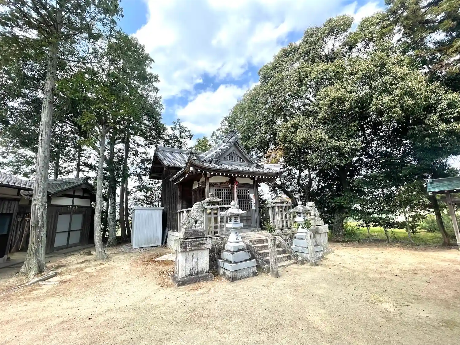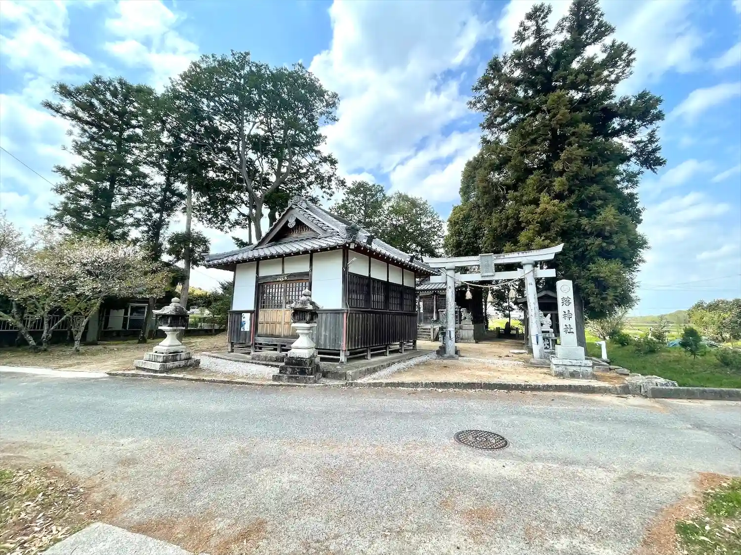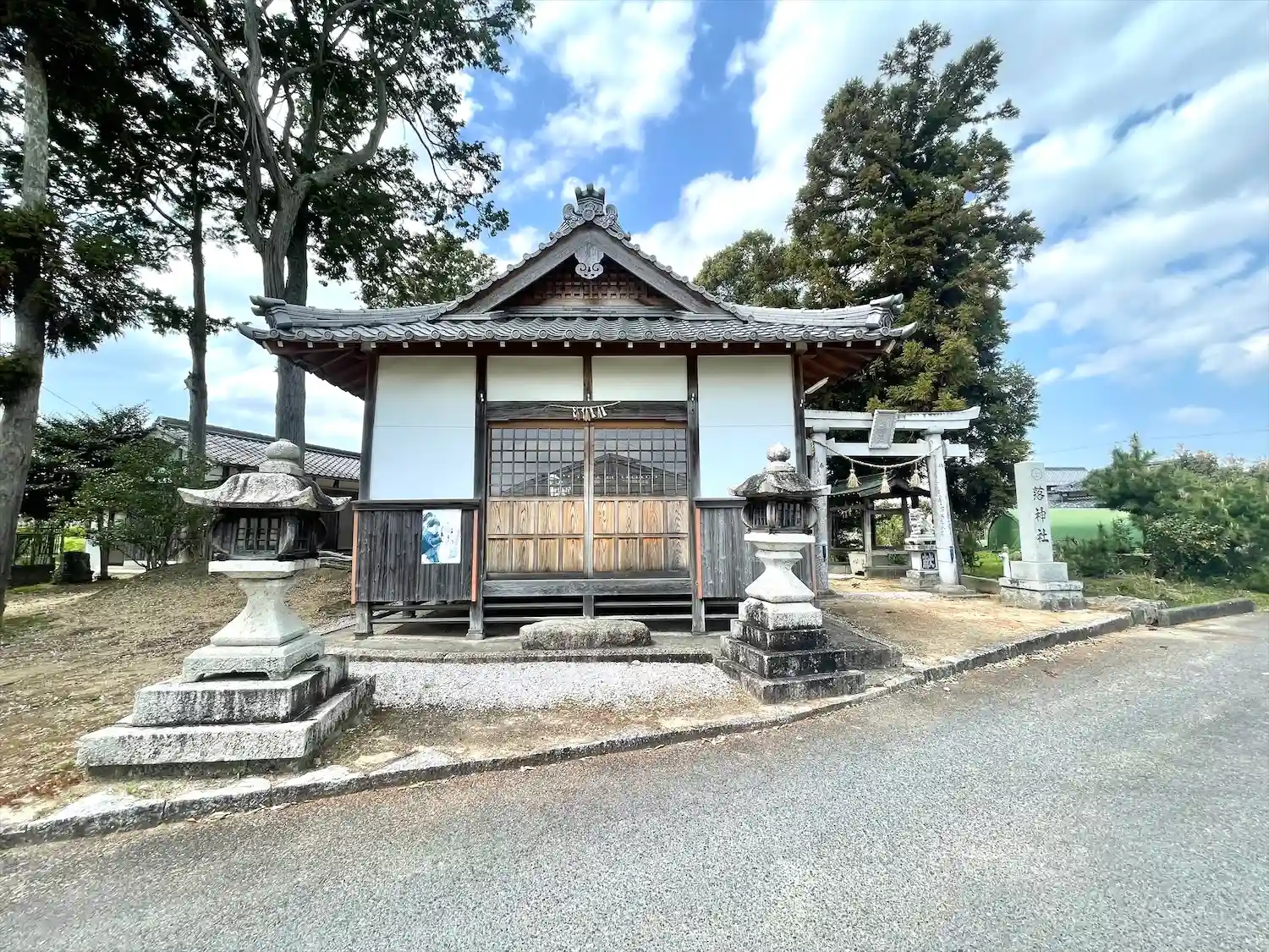 集落の中にあるこじんまりした神社です。鳥居と拝殿が並んでいる変わった造りでした。