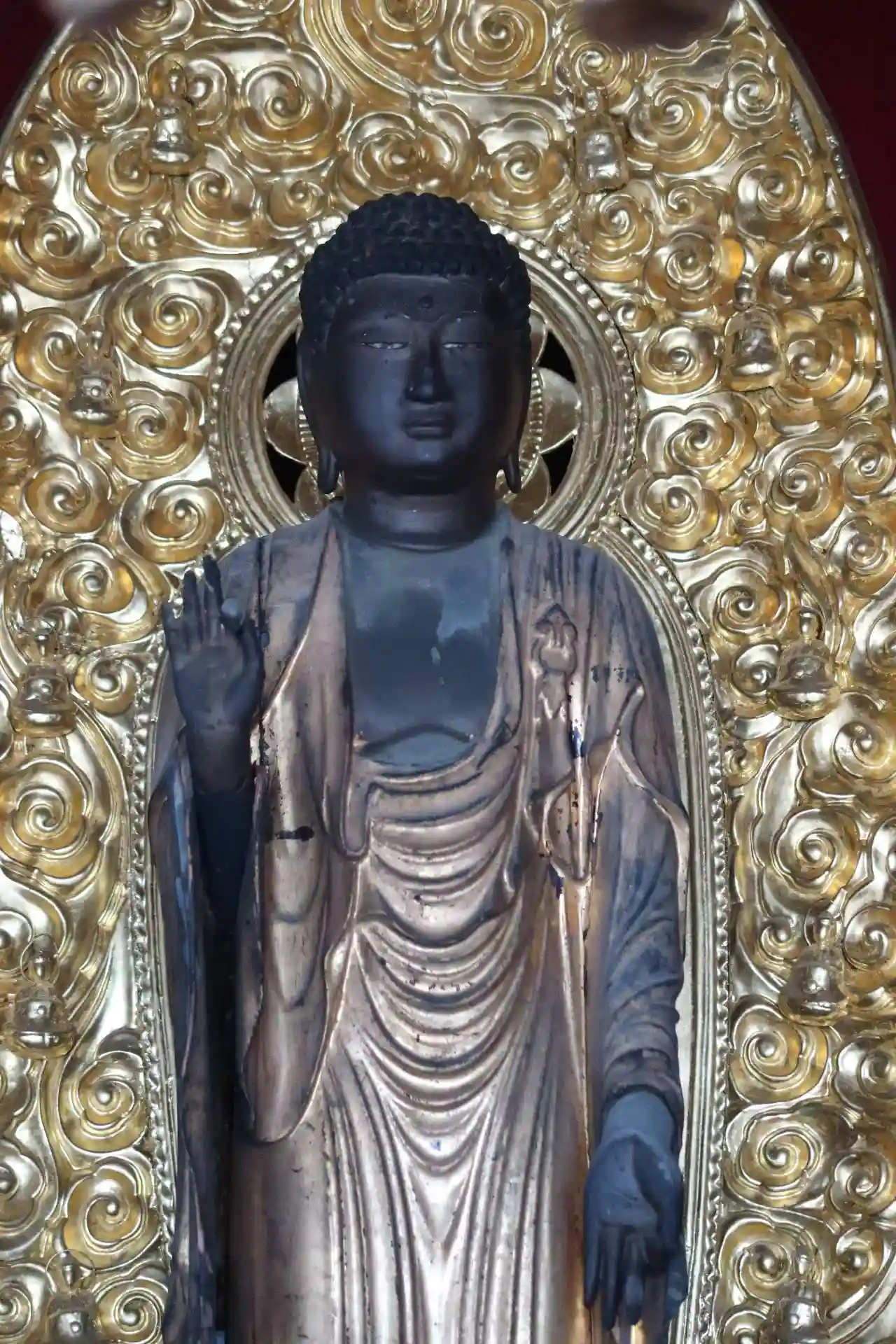 須弥壇の真ん中に本尊・阿弥陀如来坐像、高さ約85cm、彫眼、定朝様、丸顔で優しいお顔、平安時代後期の作、やや痛みと虫喰いがあります。