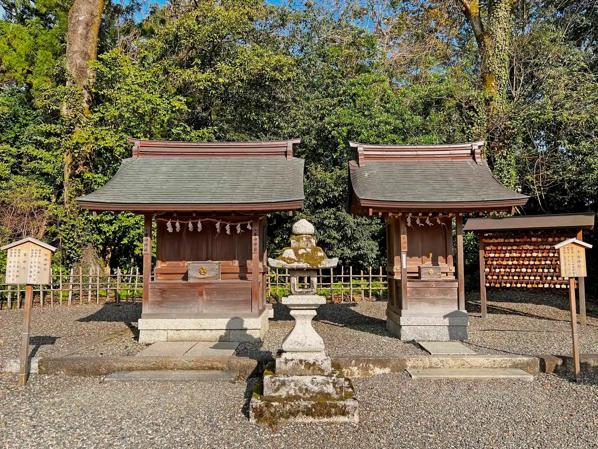 寿命石の東側にある<竈神社・年神神社>と<子安神社>。この後、境内の南東側を見て廻る。